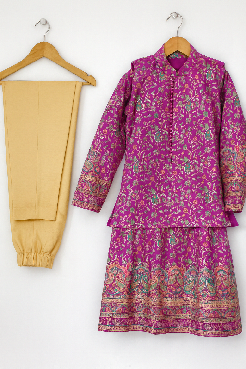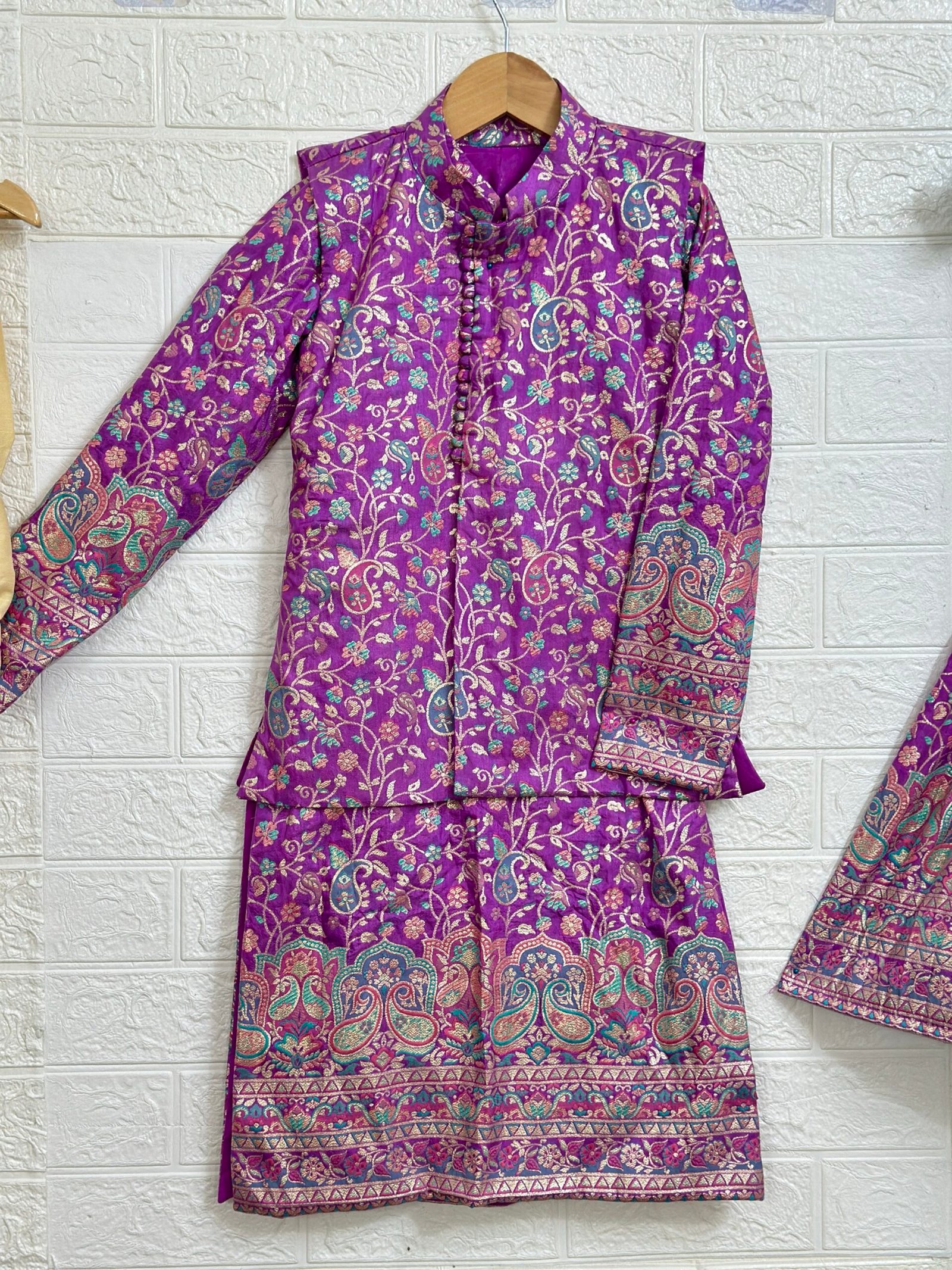 This elegant set features a classic Benaras kurta–pant, paired with a stylish coat crafted using Benaras border fabric, adding a regal finish and eye-catching charm 💫.