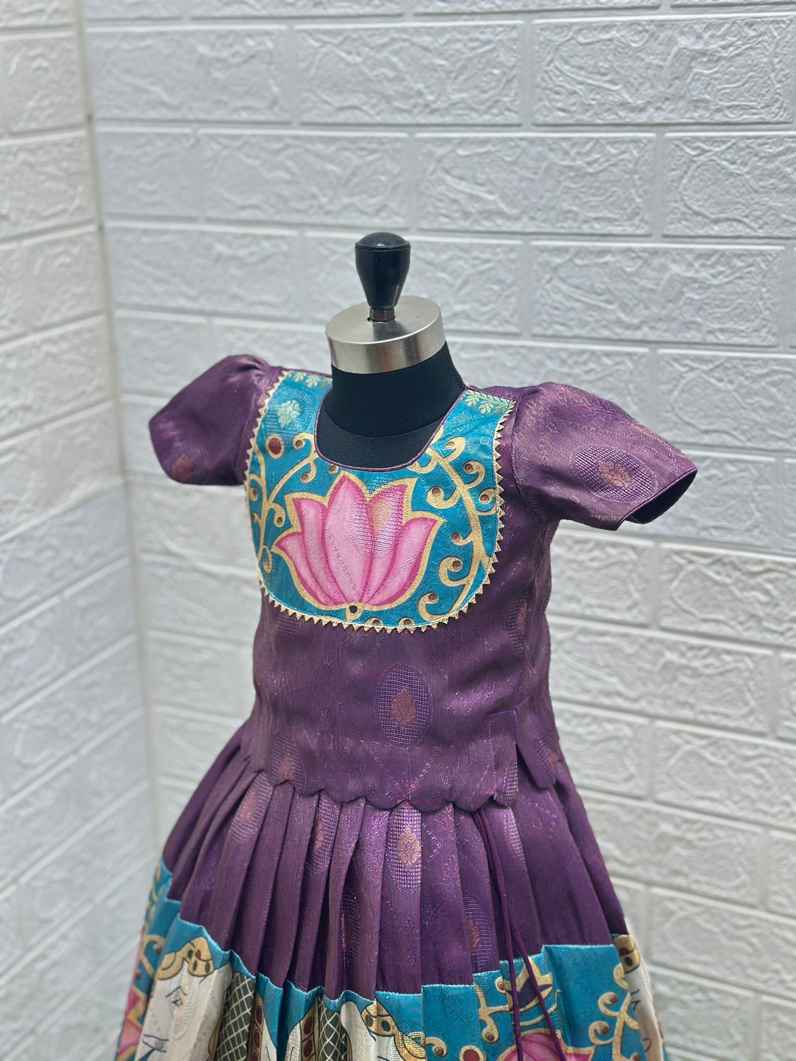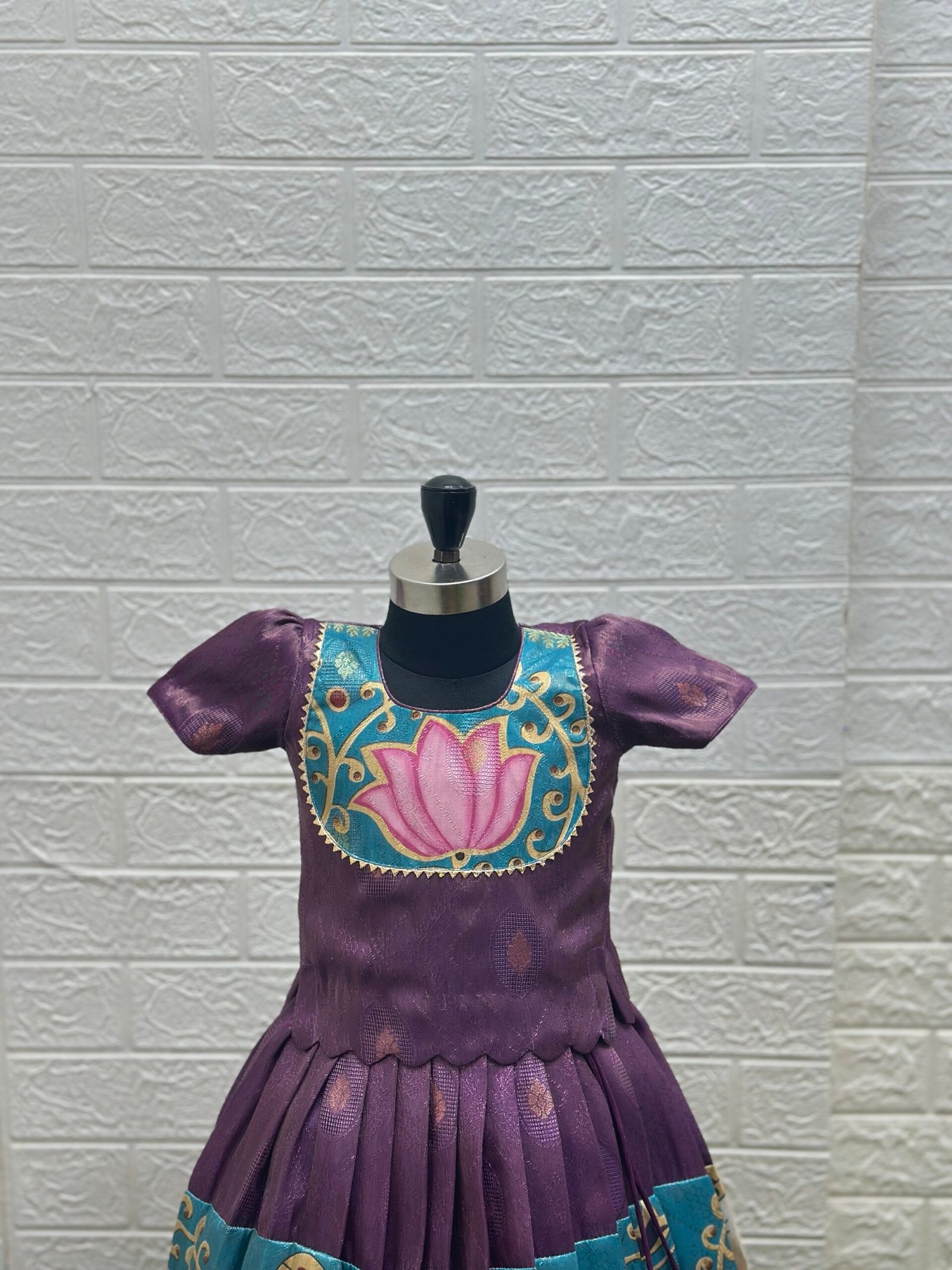 The blouse adds a modern twist – designed in a traditional style but highlighted with a scallop waist finish and a lotus print halter-style neckline patch 🌸, making it both stylish and comfortable for kids to wear.