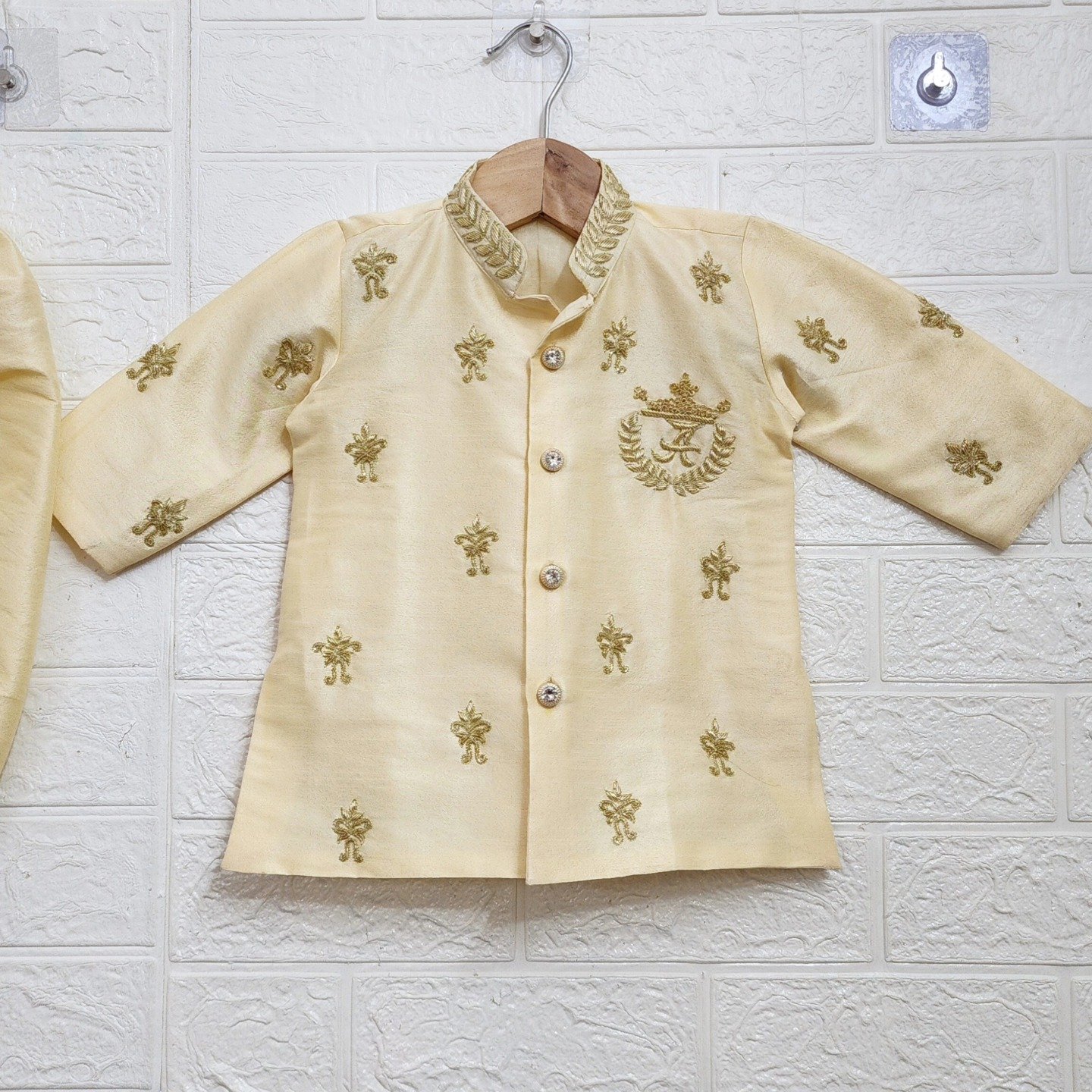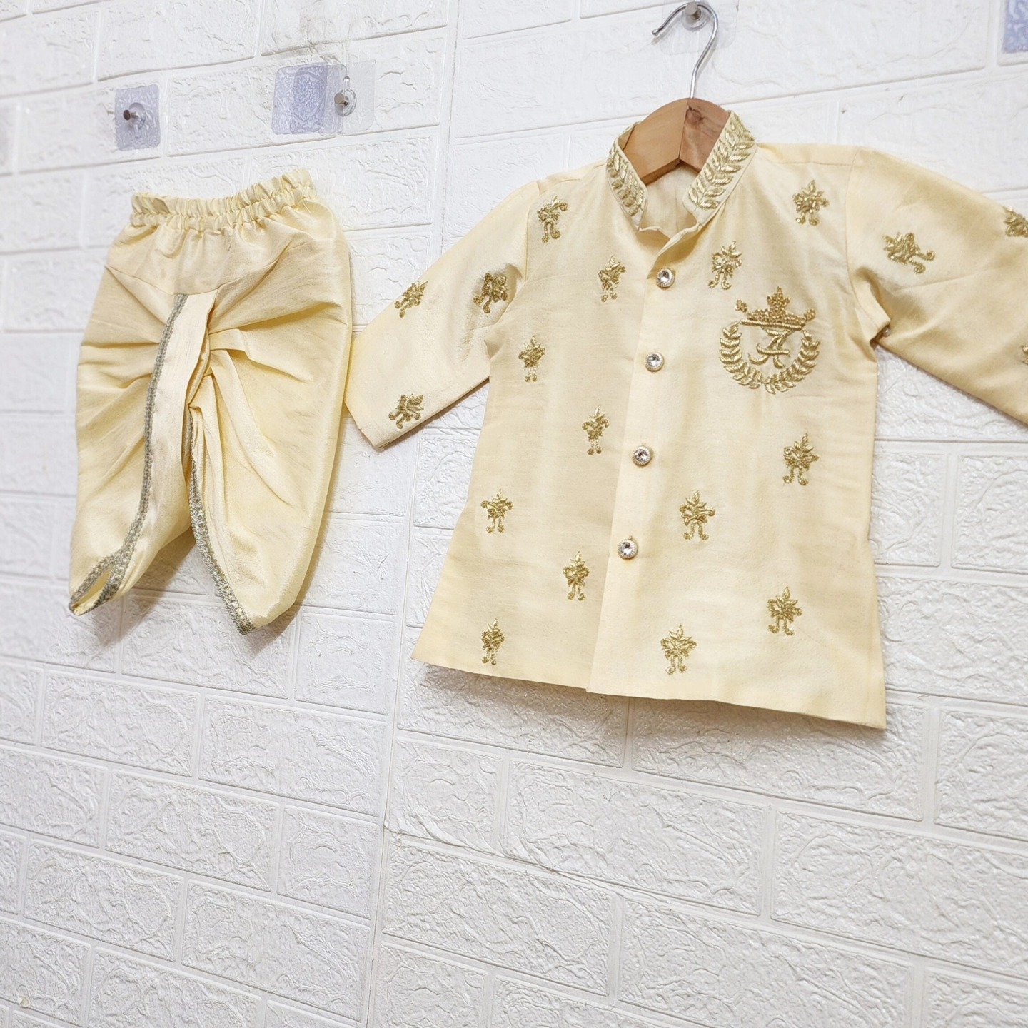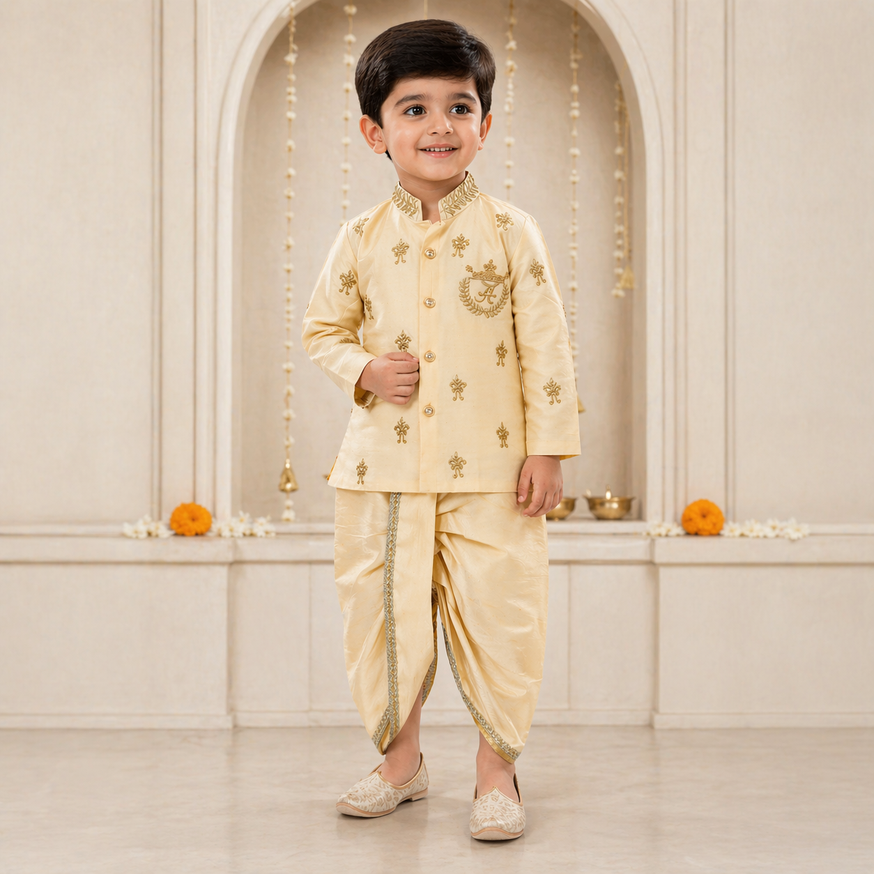 Dress your little prince in timeless tradition with this elegant kurta dhoti set. Crafted in a soft champagne gold shade, the outfit features delicate embroidery motifs and a regal emblem that adds a touch of sophistication. The comfortable fabric ensures ease of movement, while the classic dhoti style enhances the traditional charm. Perfect for weddings, festive celebrations, and special occasions, this ensemble brings together style, grace, and comfort for your little one. ✨