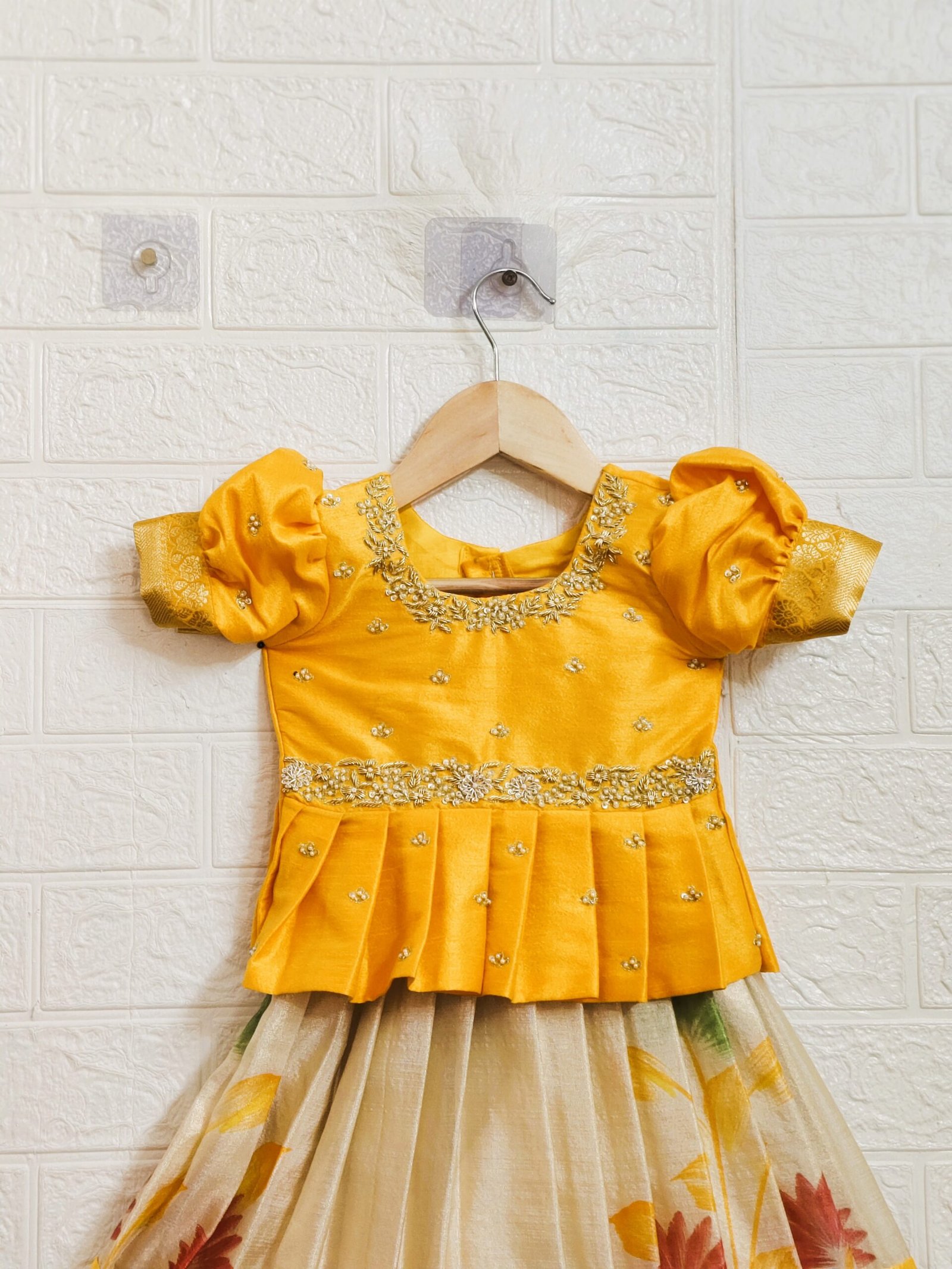 A stunning blend of elegance and festive charm, this Cream Banaras Lehenga paired with a beautifully crafted Yellow Peplum Blouse is designed to make your little one glow like a princess 💛🌼