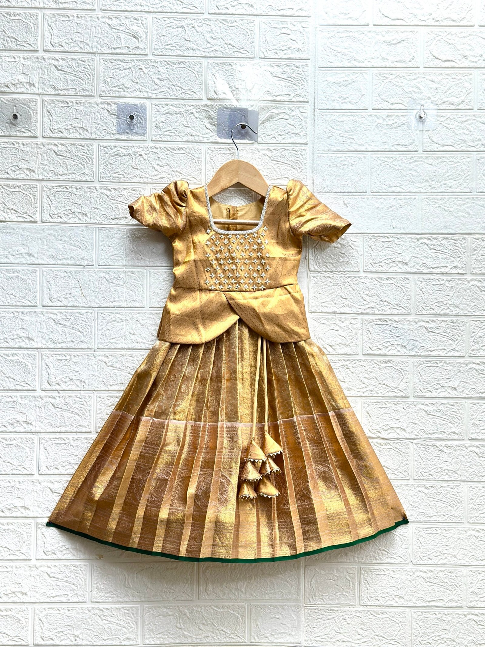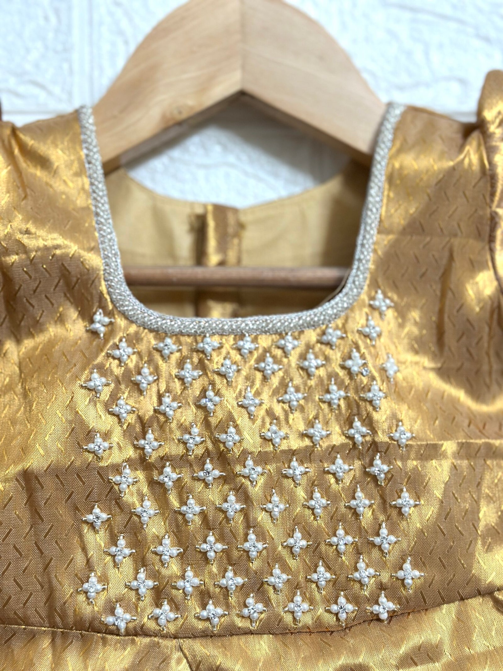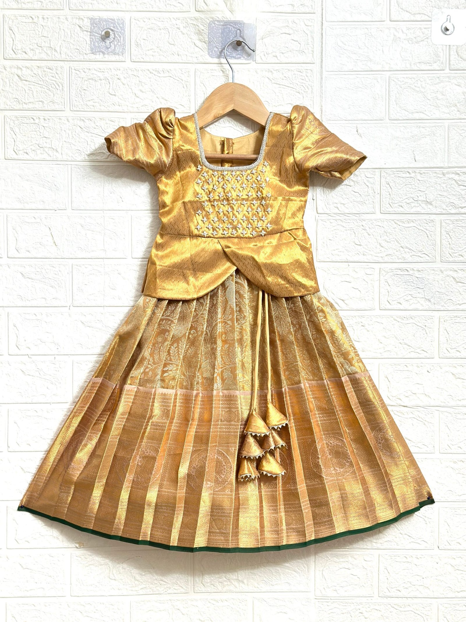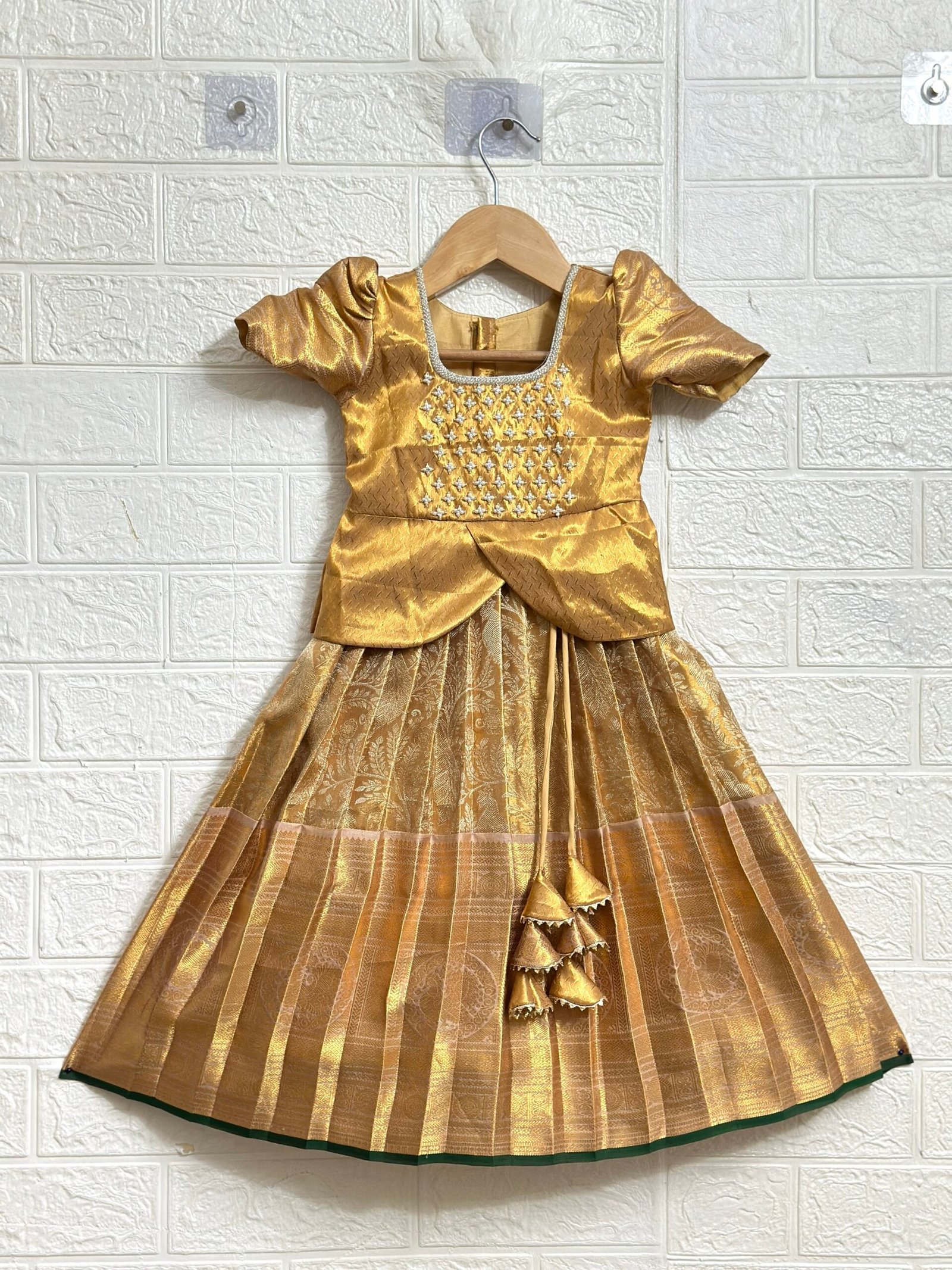 This stunning gold colour pure handloom Kanchi lehanga is paired with a matching Kanchi blouse featuring beautiful front maggam work. The apple-cut waist design and stylish shoulder-puff sleeves add extra charm, giving the outfit a royal and graceful finish 👑🌼