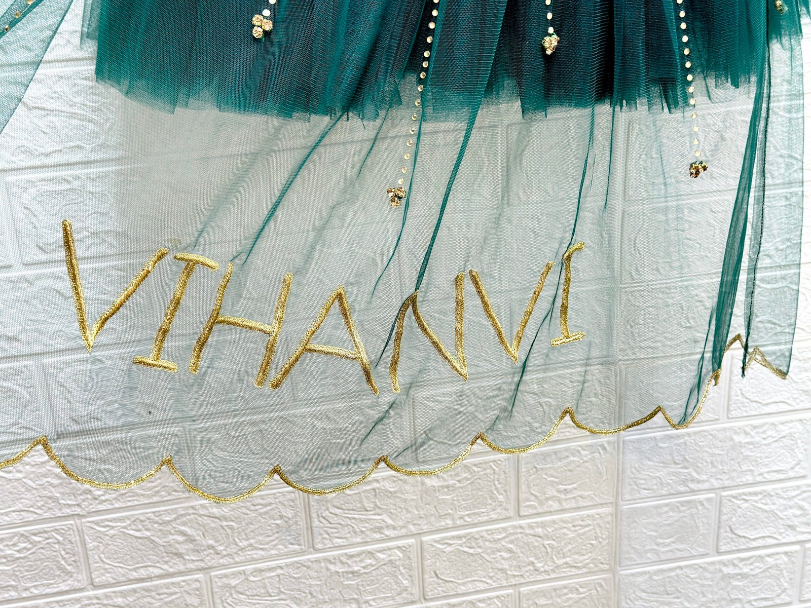 A custom-crafted Wale featuring your little one’s name (please mention name in additional comment), accented with elegant pearls for a truly unique touch. Yoke An exquisite, delicate veil featuring intricate Maggam highlights and handmade floral detailing that adds a regal finish