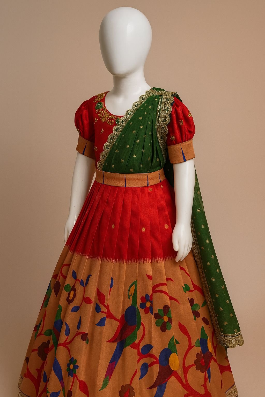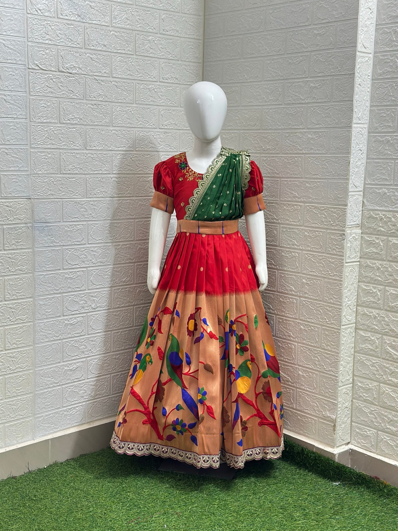 Paired with a contrasting Paithani dupatta, this piece showcases a beautiful Munia border as belt attached to dupatta, known for its classic and cultural significance. The delicate weaving and bold colors lend an elegant and timeless look.