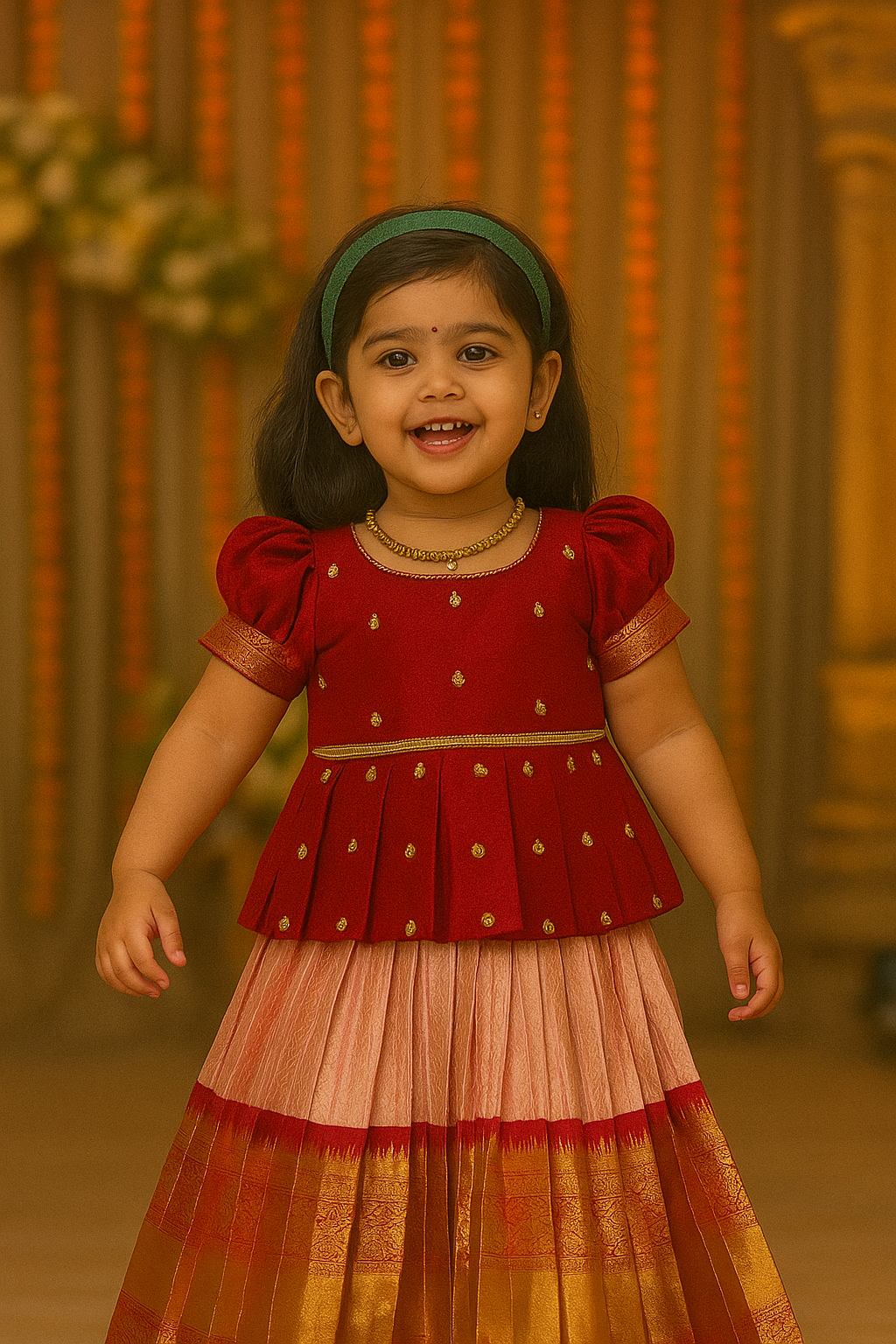 A perfect fusion of tradition & elegance, this Kanjeevaram Lehenga is crafted with neatly ironed pleats for a graceful flow. Paired with a peplum blouse adorned with intricate maggam work and puff sleeves, this outfit radiates festive charm and timeless style 🌸.