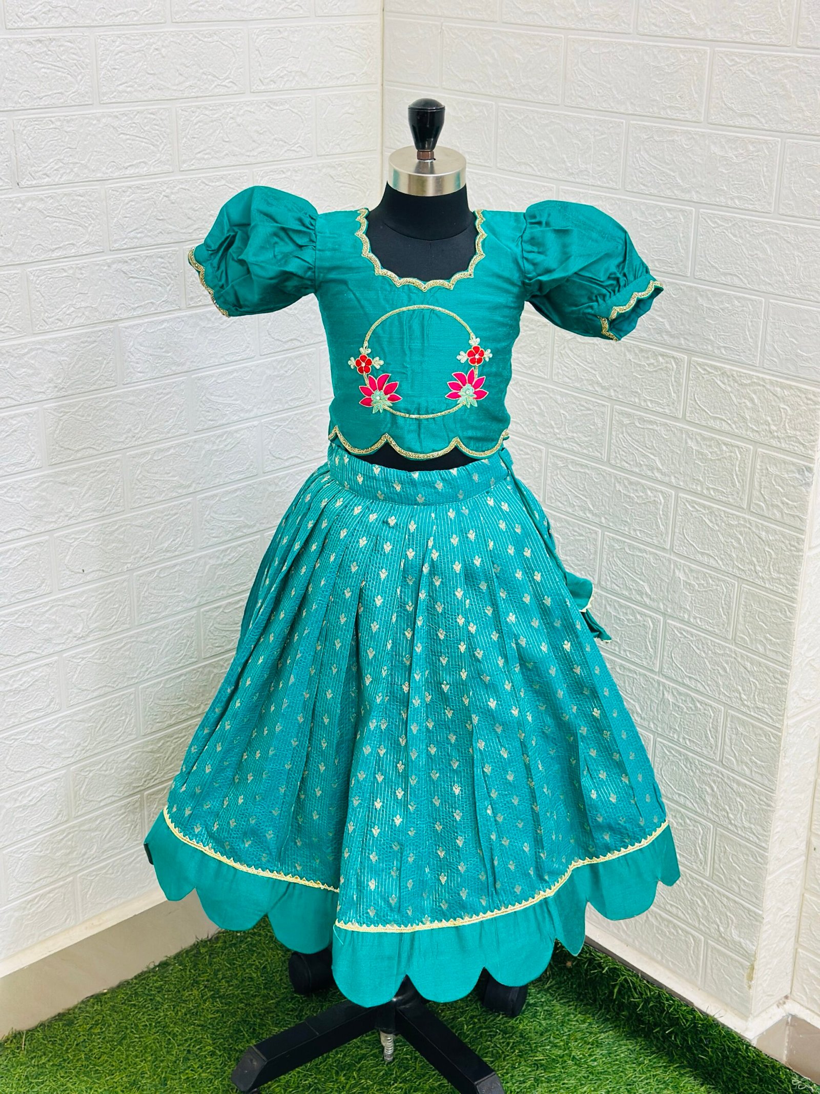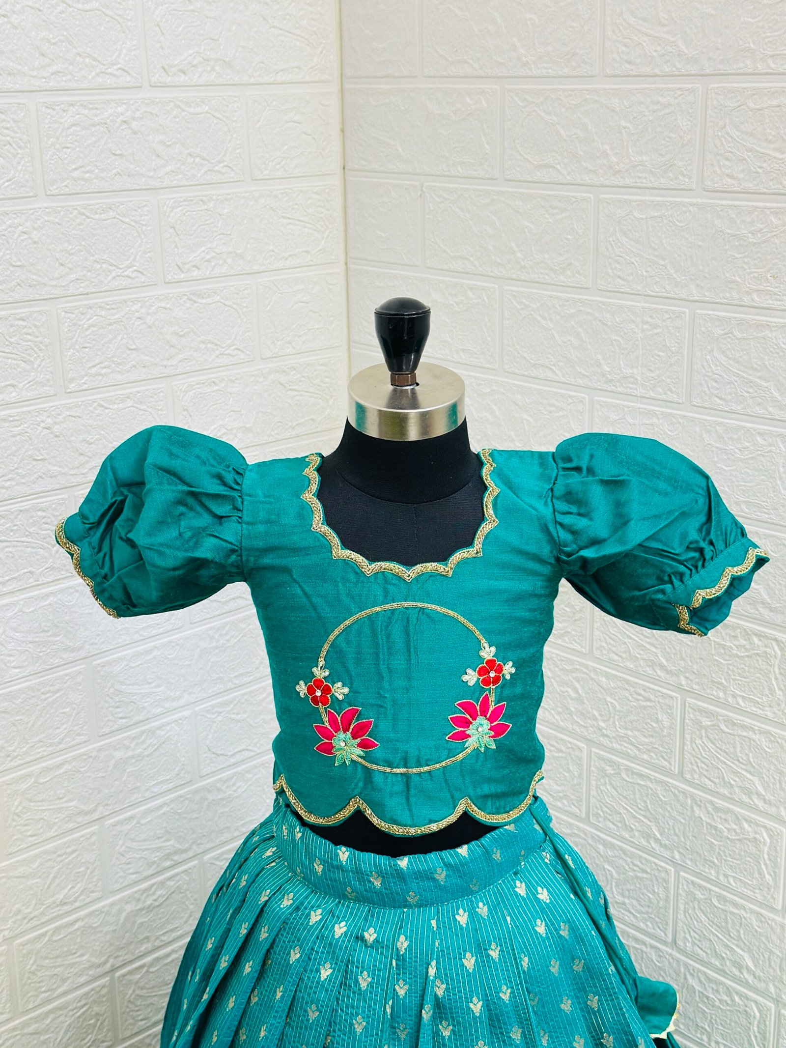 Designed with a customized scalloped border highlighted with delicate lace, this lehenga is paired with a stunning maggam work raw silk crop-top blouse featuring stylish puff sleeves — a perfect blend of tradition and trend 💛