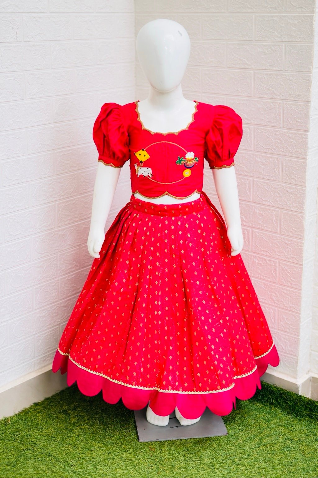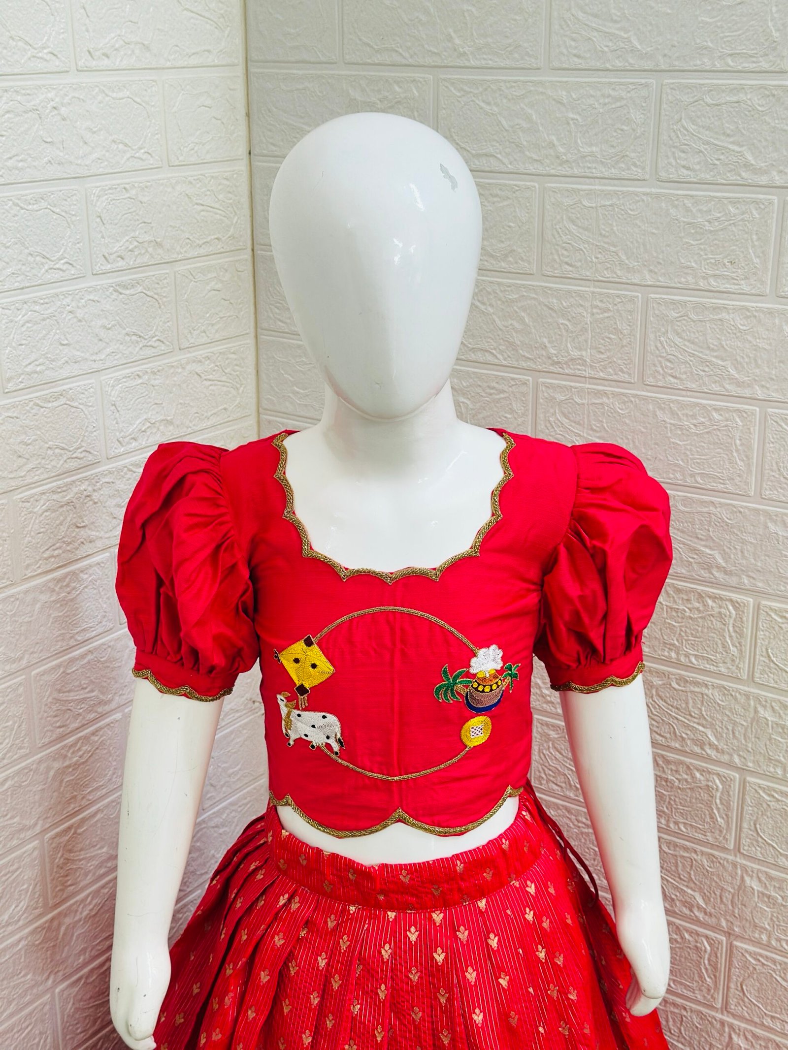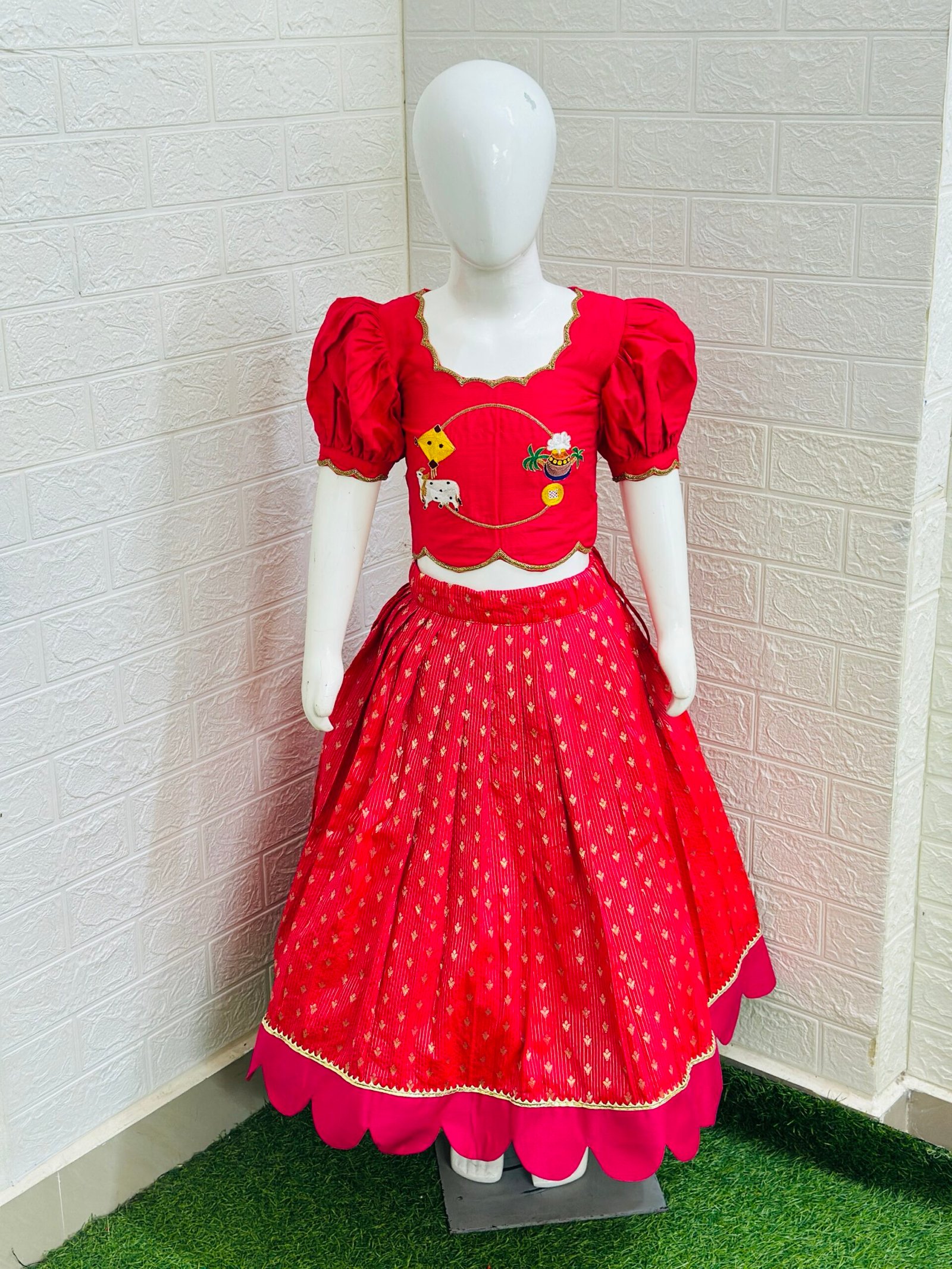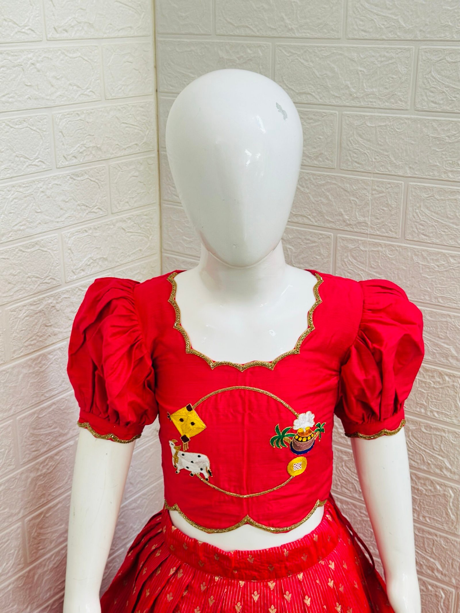 Designed with a customized scalloped border highlighted with delicate lace, this lehenga is paired with a stunning maggam work raw silk crop-top blouse featuring stylish puff sleeves — a perfect blend of tradition and trend 💛