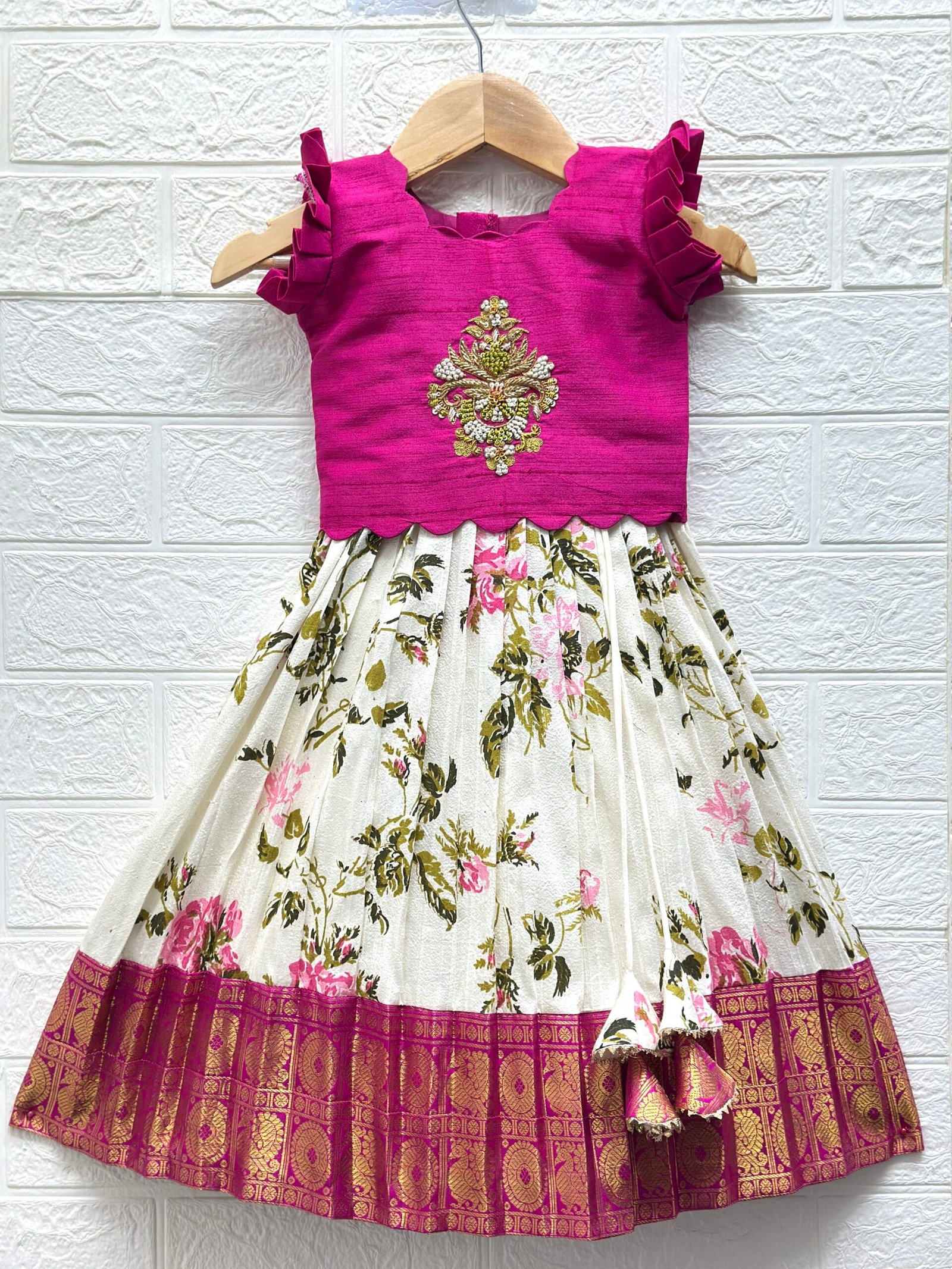 Elevate your little one’s festive wardrobe with this luxurious cream Pure Raw Silk Lehenga, designed with a beautiful traditional weave and finished with an elegant pink Kanchi border.