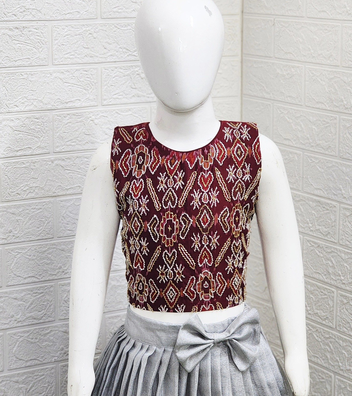 Crafted in a soothing silver-grey tone, the pleated skirt adds a graceful movement, enhanced with a statement bow at the waist for a touch of playful sophistication. The contrasting printed border and delicate layered tassel detailing create a perfect harmony of texture and design also with Maggam Highlithed sleveless blouse.
