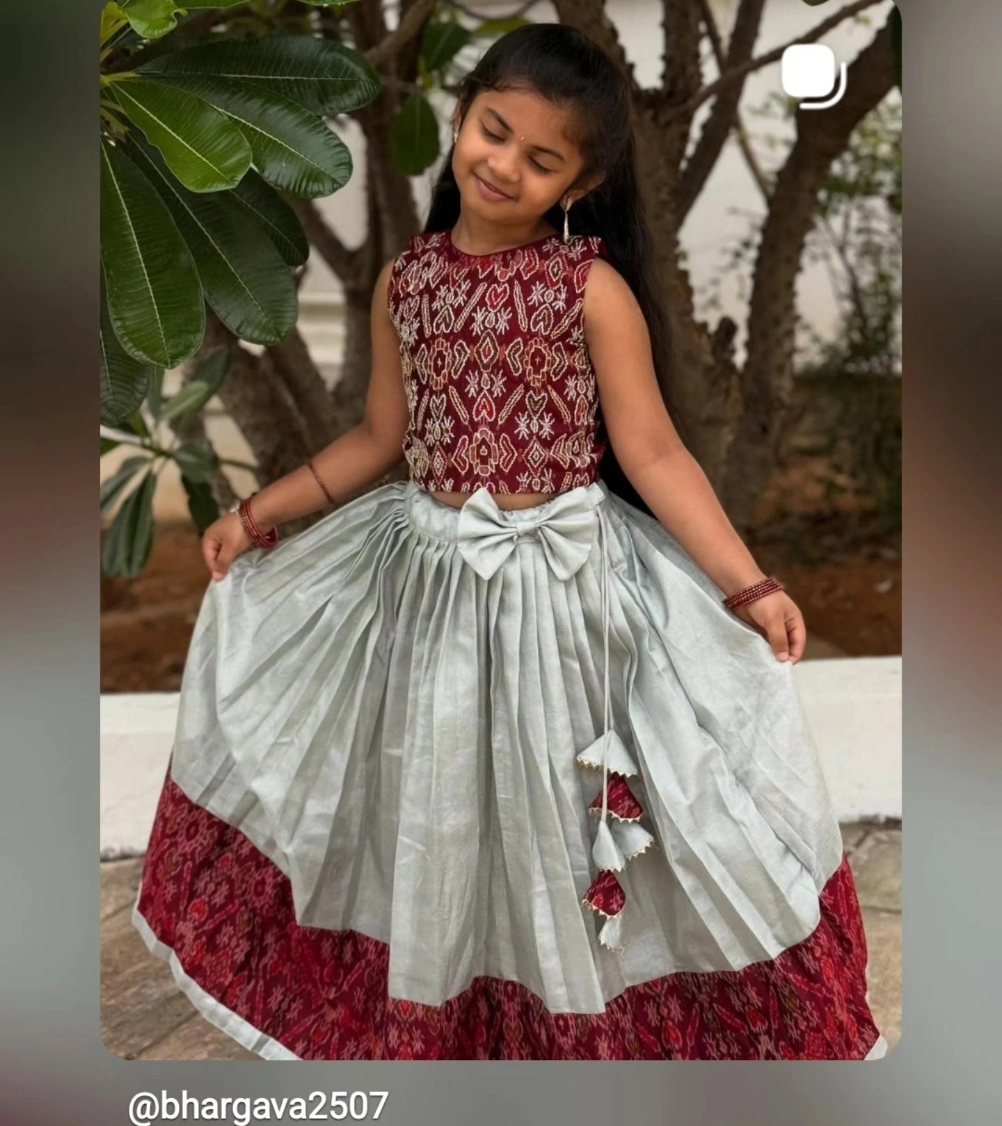 Lehenga: Pure Silver Tissue lehenga with pochampally silk border paired with cute bow