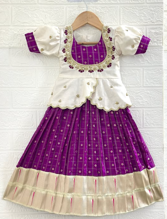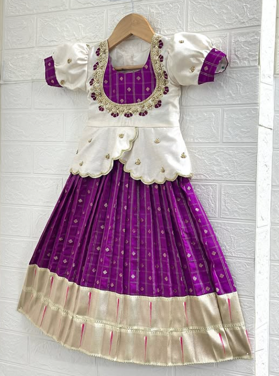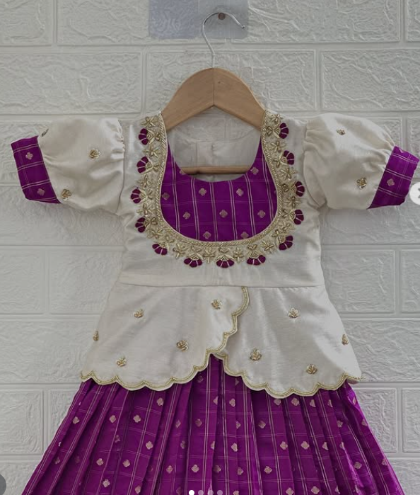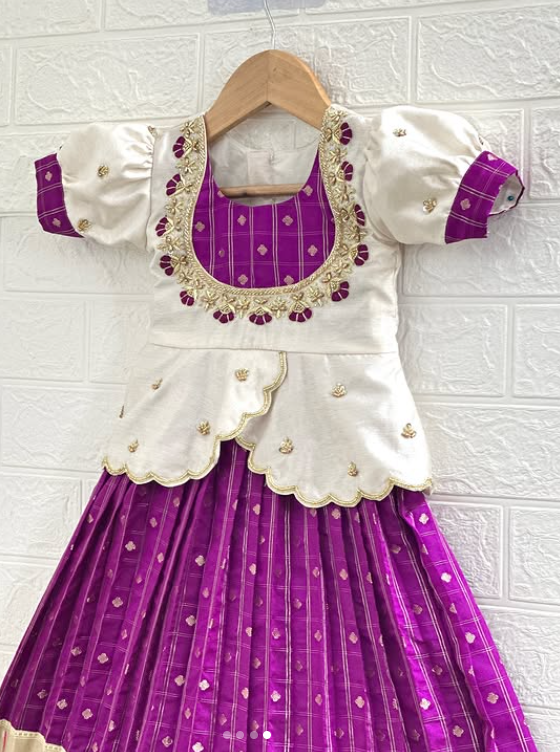Bring home a perfect blend of tradition and charm with this stunning ethnic ensemble for your little girl. Featuring a rich violet skirt adorned with delicate gold motifs and paired with a beautifully crafted ivory peplum-style top, this outfit radiates timeless elegance. The intricate neckline detailing and soft layered design add a graceful touch, while the broad zari border enhances its festive appeal✨.