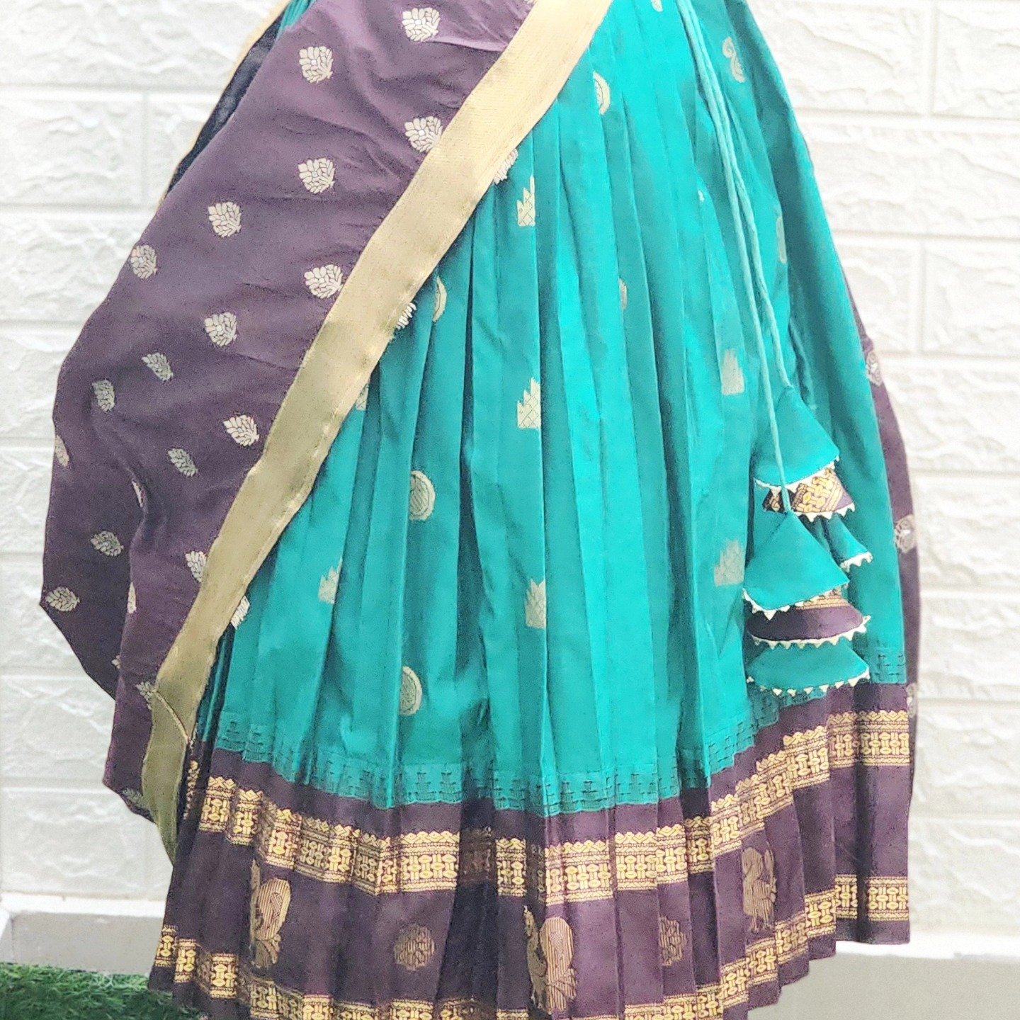 Rama green semi gadwal lehenga with brown blouse and duppata