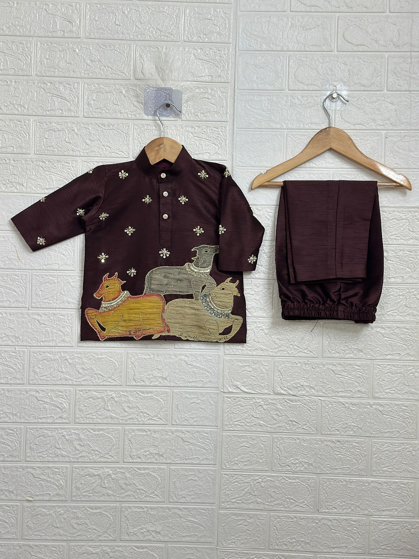 ✨ Brown Raw Silk Kurta with Pure Pen Kalamkari Appliqué & Hand Maggam Highlights