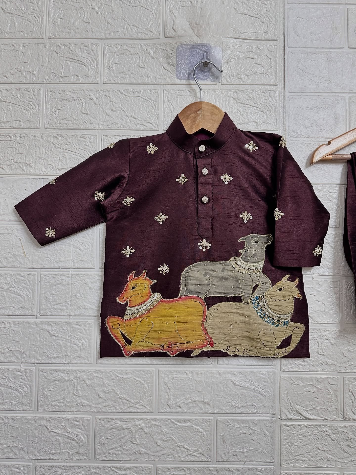 Step into elegance with this premium Brown Raw Silk Men’s Kurta, embellished with authentic Pure Pen Kalamkari appliqué work and beautifully finished maggam hand detailing around the neckline.