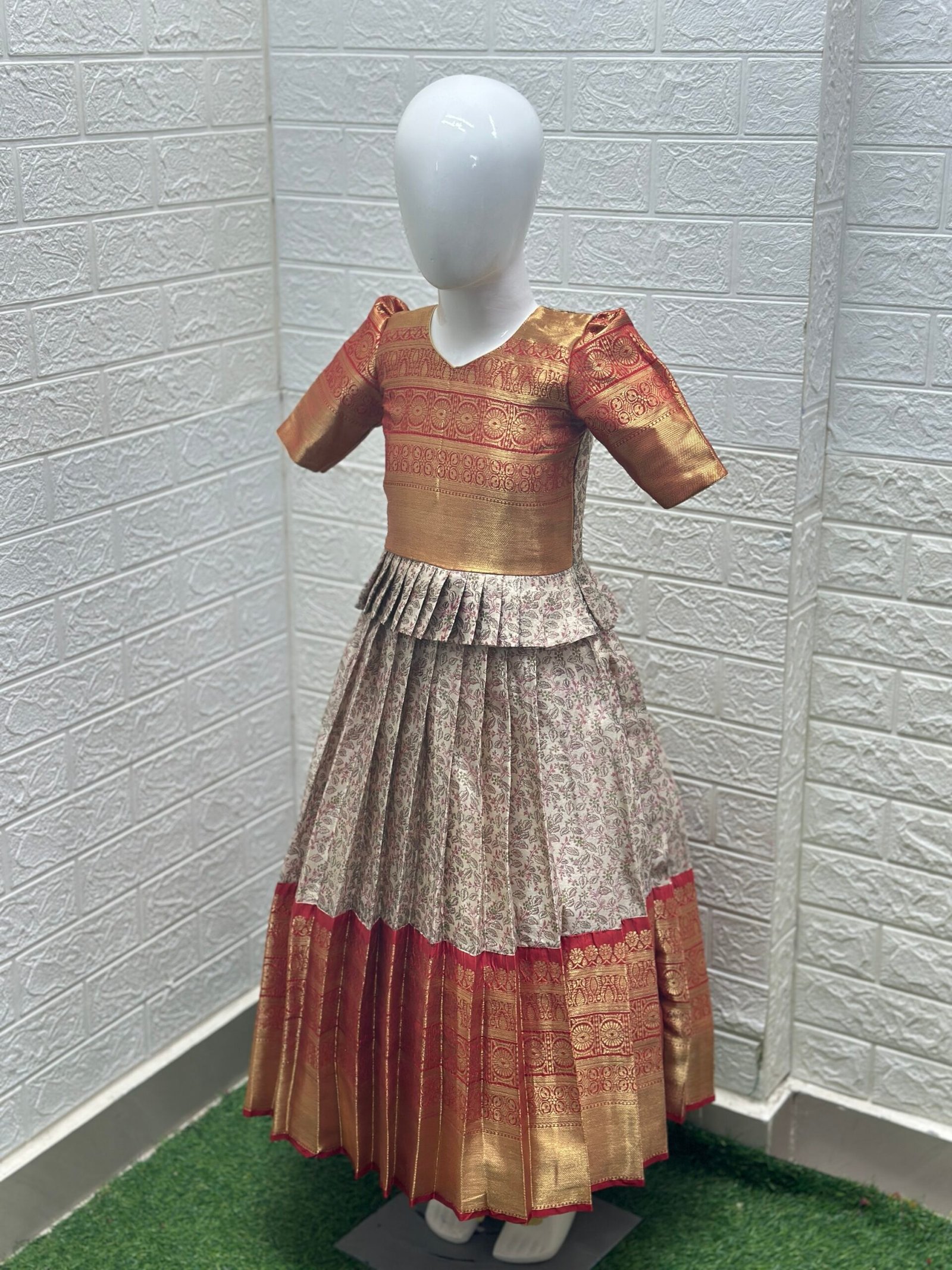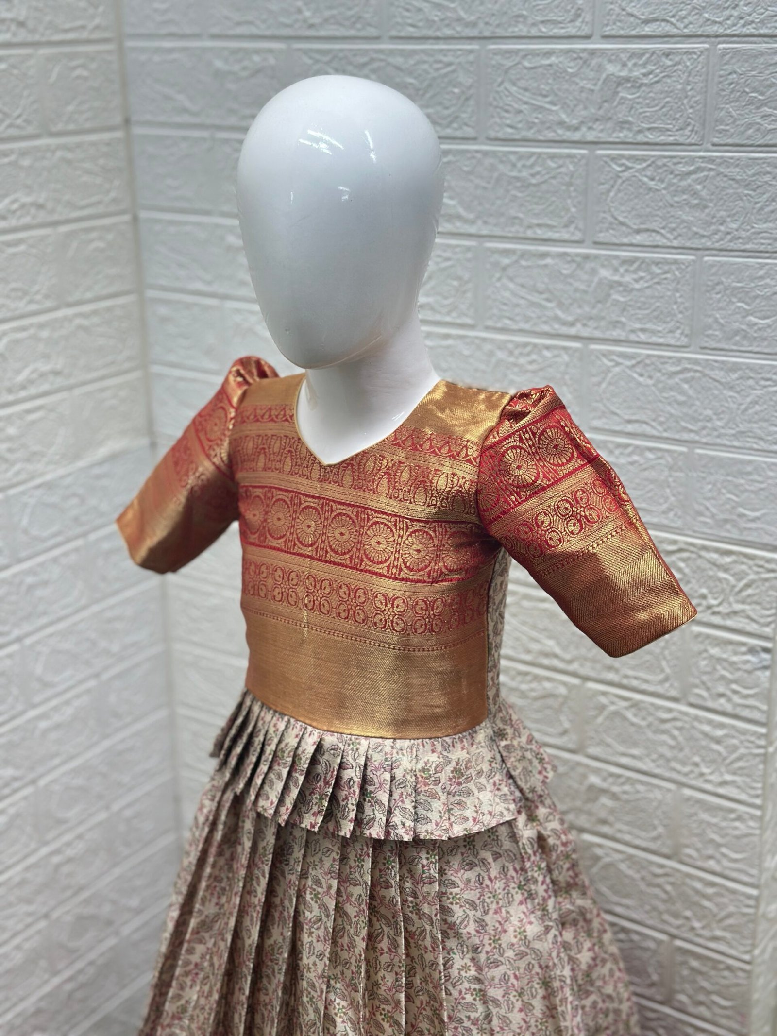 Semi Kanjeevaram Sleveless frock made with iron pleats and paired with Blouse with border as patch at below neck n gave short puff hands which is looking very pretty.