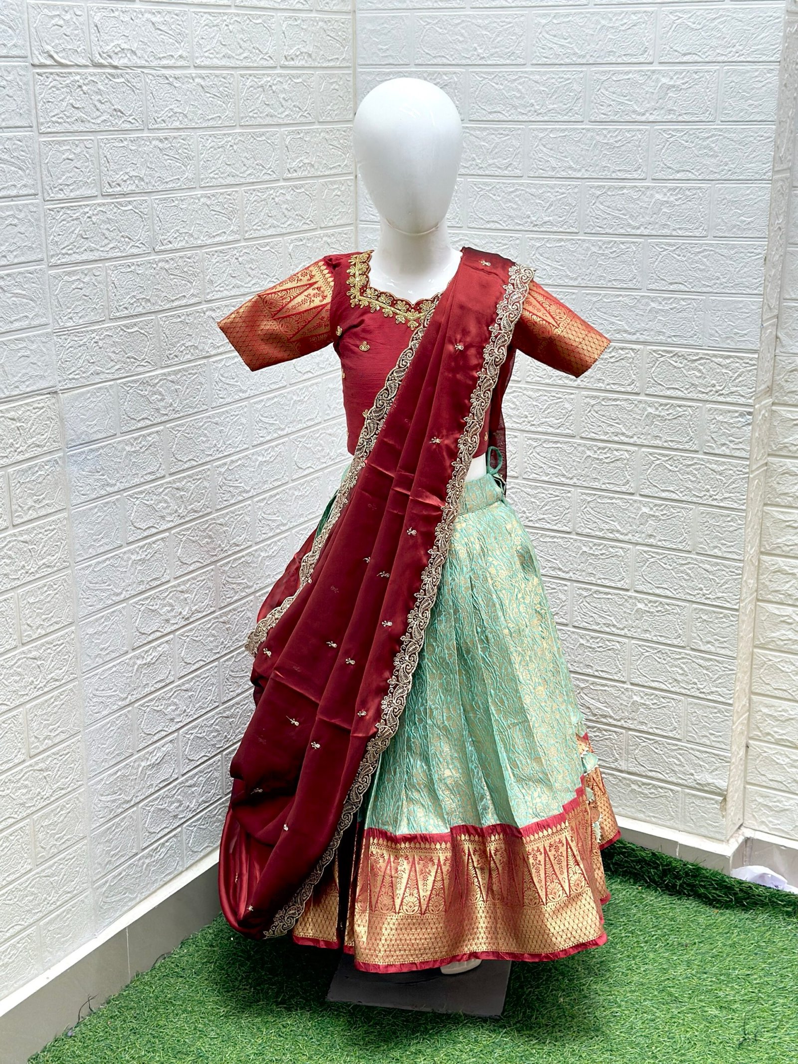 Our most-loved Semi Kanjeevaram Lehenga is crafted to turn heads with its timeless elegance and rich detailing. It is paired with a designer raw silk blouse, beautifully adorned with intricate maggam work, adding a regal touch to the entire look.