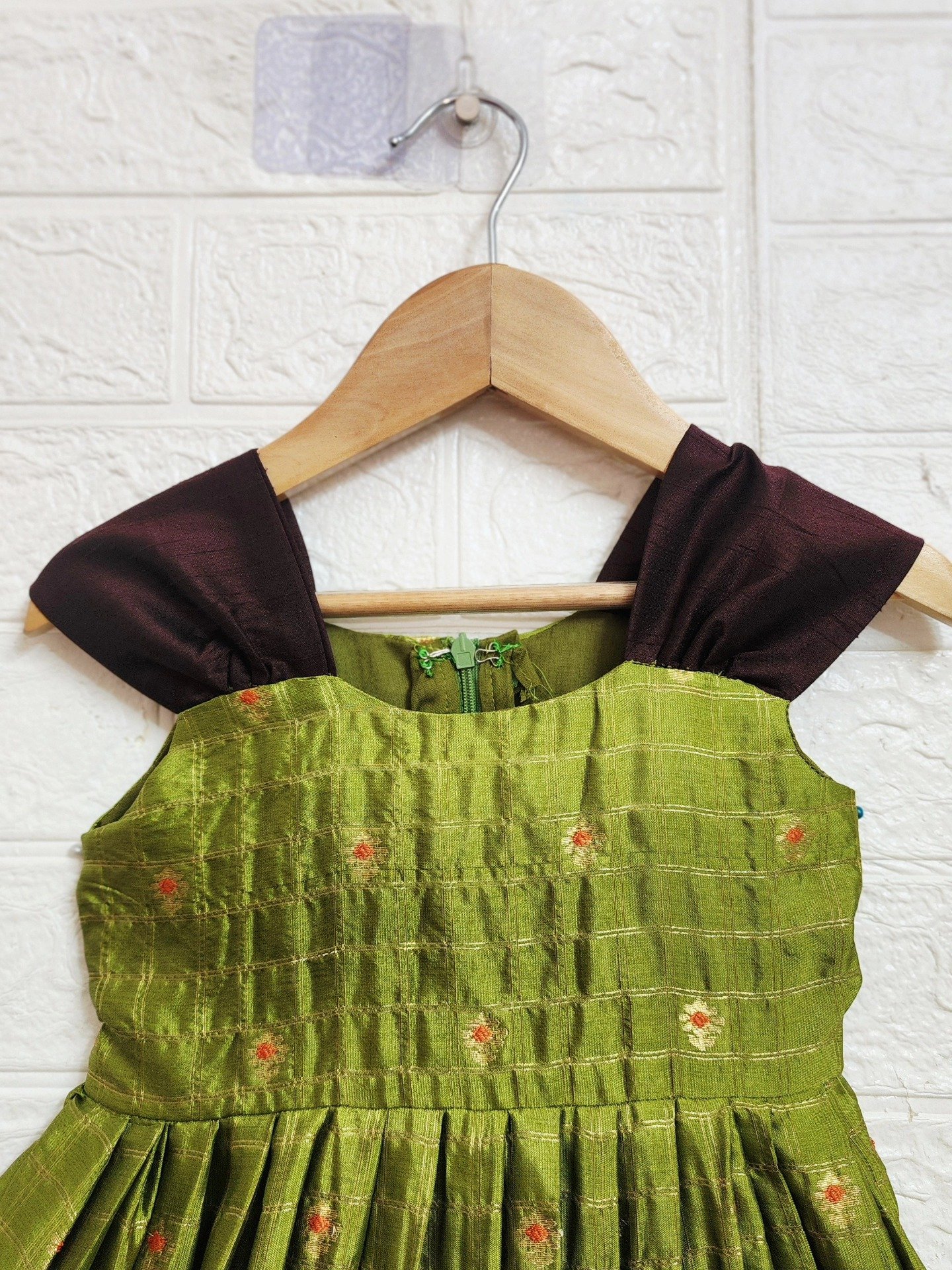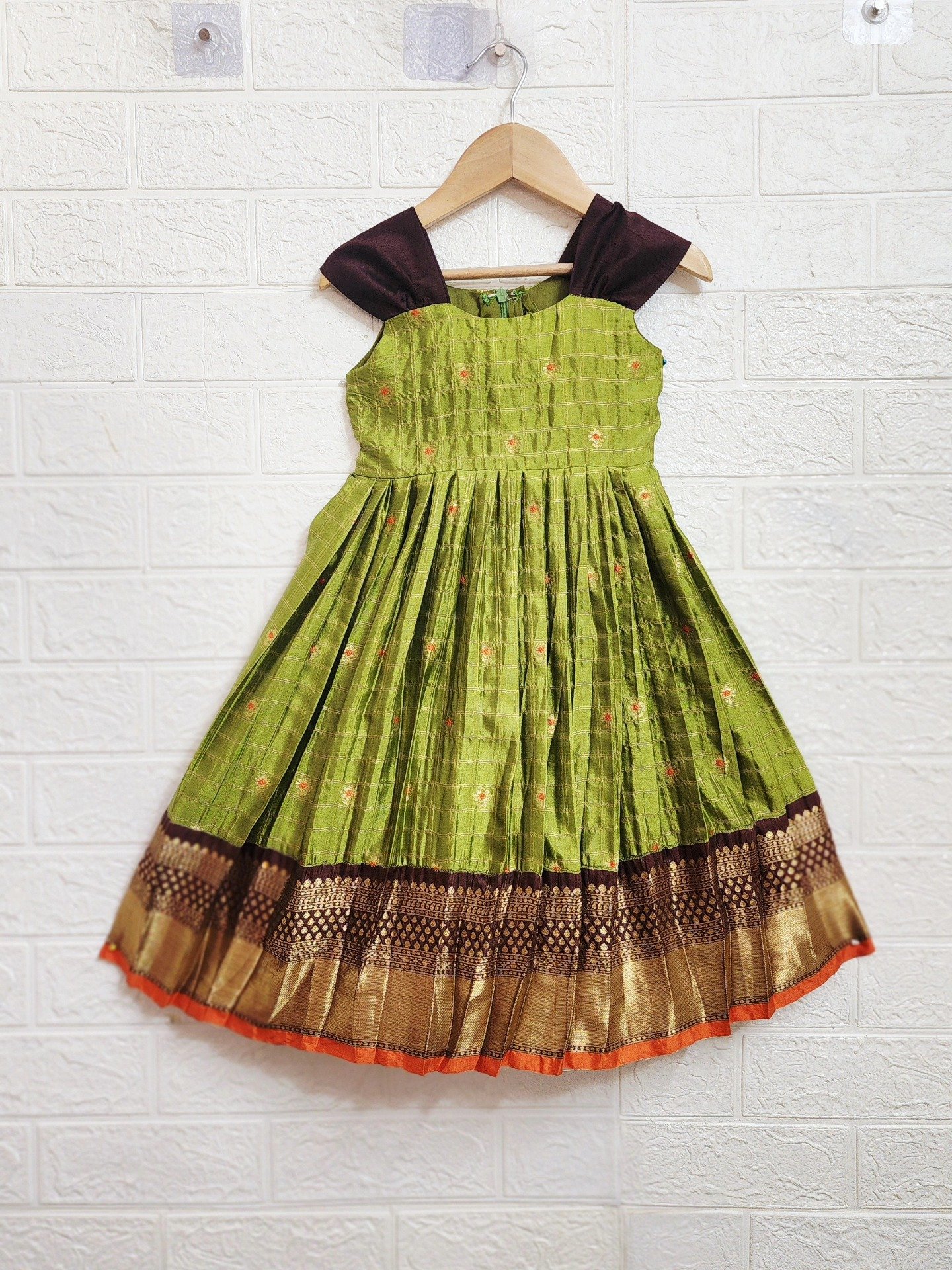 Fresh, vibrant, and full of festive charm—this gorgeous green ethnic dress is a perfect blend of tradition and style. Designed with soft pleats and subtle woven detailing, it features contrasting shoulder accents and a rich zari border that adds a touch of elegance. The pop of earthy tones along the hem makes it stand out effortlessly. Lightweight, comfortable, and twirl-worthy, it’s the perfect pick for festive days, family gatherings, and special little moments.