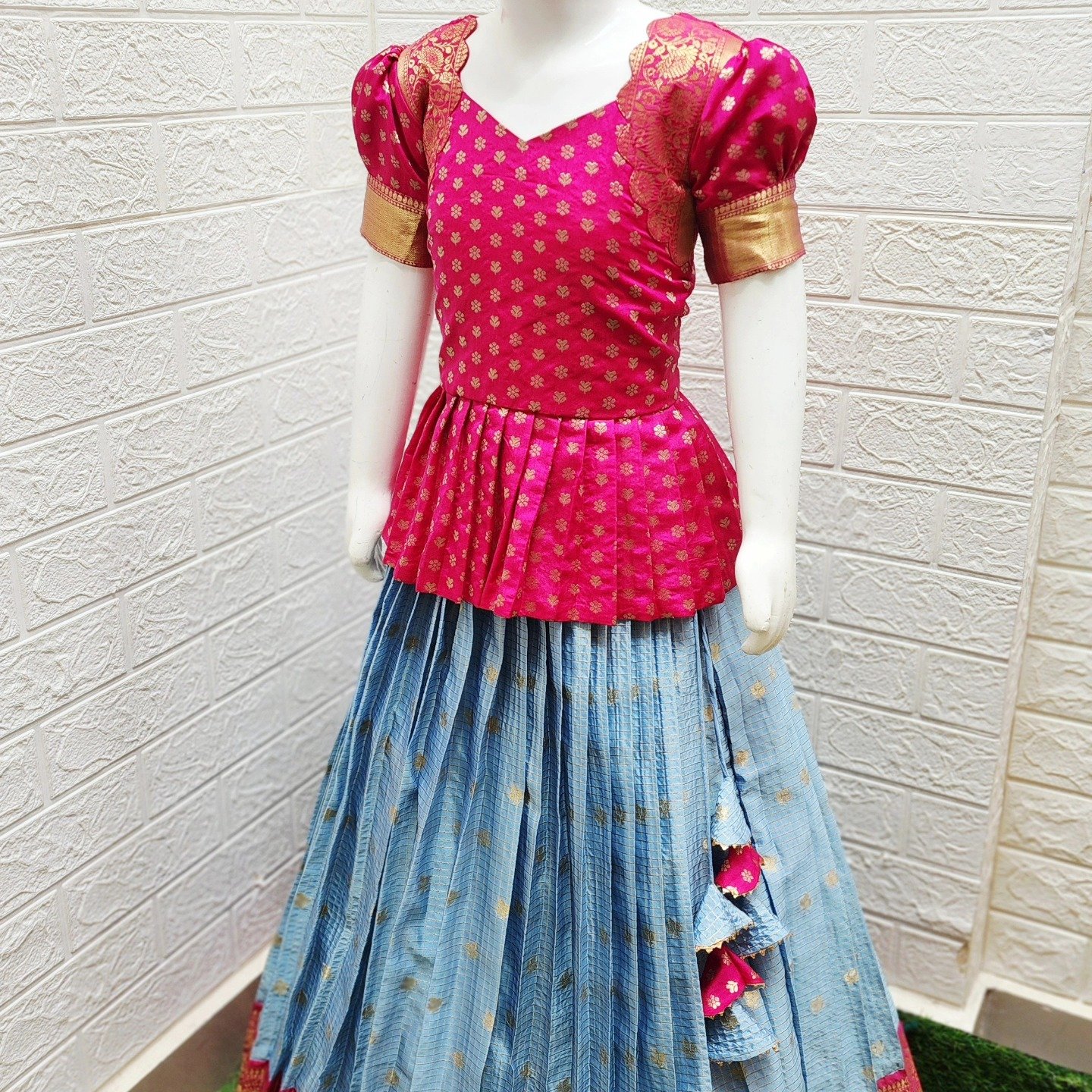 Make every celebration extra special with this stunning fusion ensemble, designed to capture hearts at first glance. The vibrant pink peplum blouse, adorned with delicate gold motifs and rich zari detailing on the sleeves, brings a regal and festive charm.