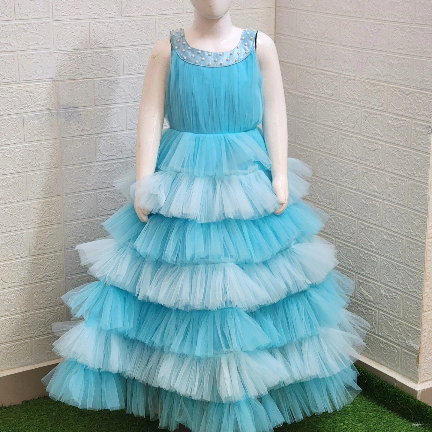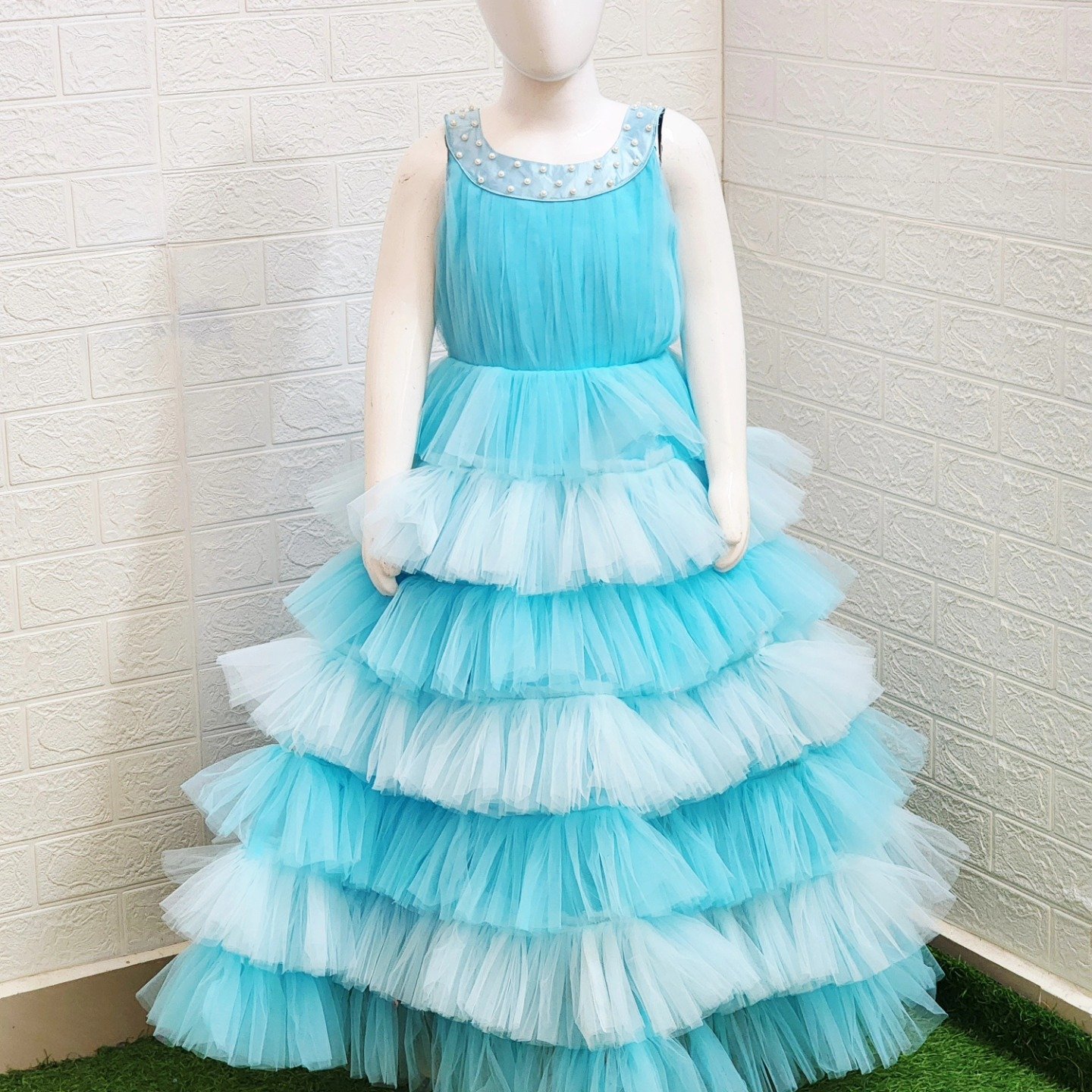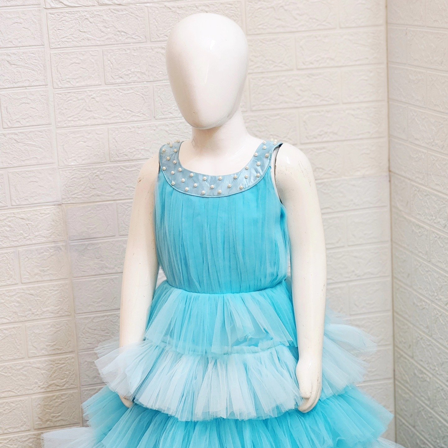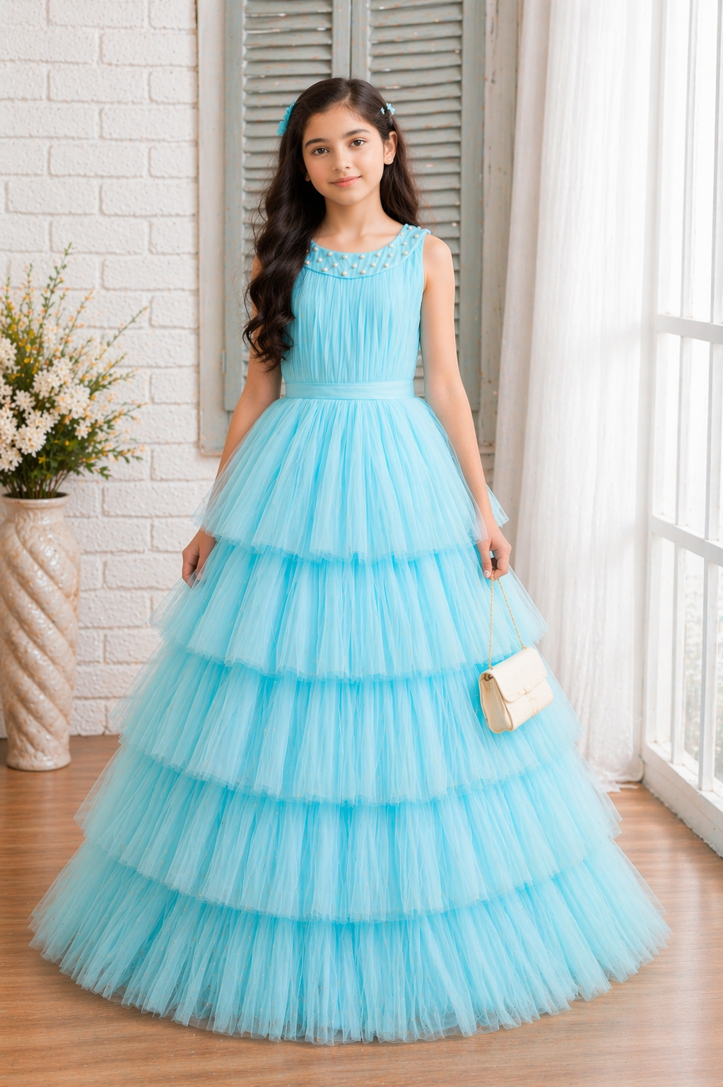 Turn every moment into a fairytale with this enchanting aqua blue gown, designed to bring out pure elegance and charm. Featuring a delicately embellished pearl neckline, this dress adds a subtle touch of sophistication. 🎉👑