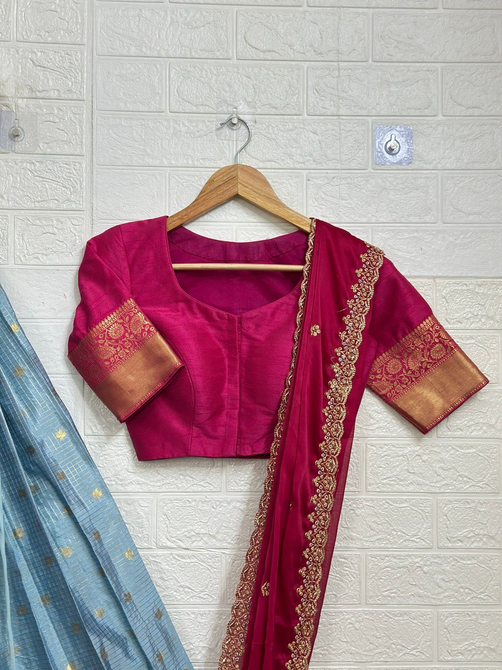 👚 Blouse: Designer Gadwal blouse enhanced with classic zari borders on the sleeves