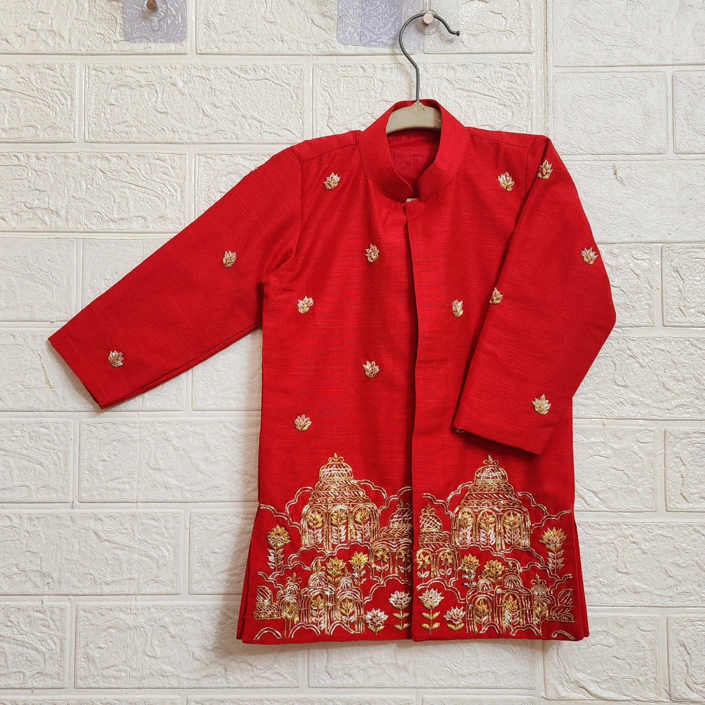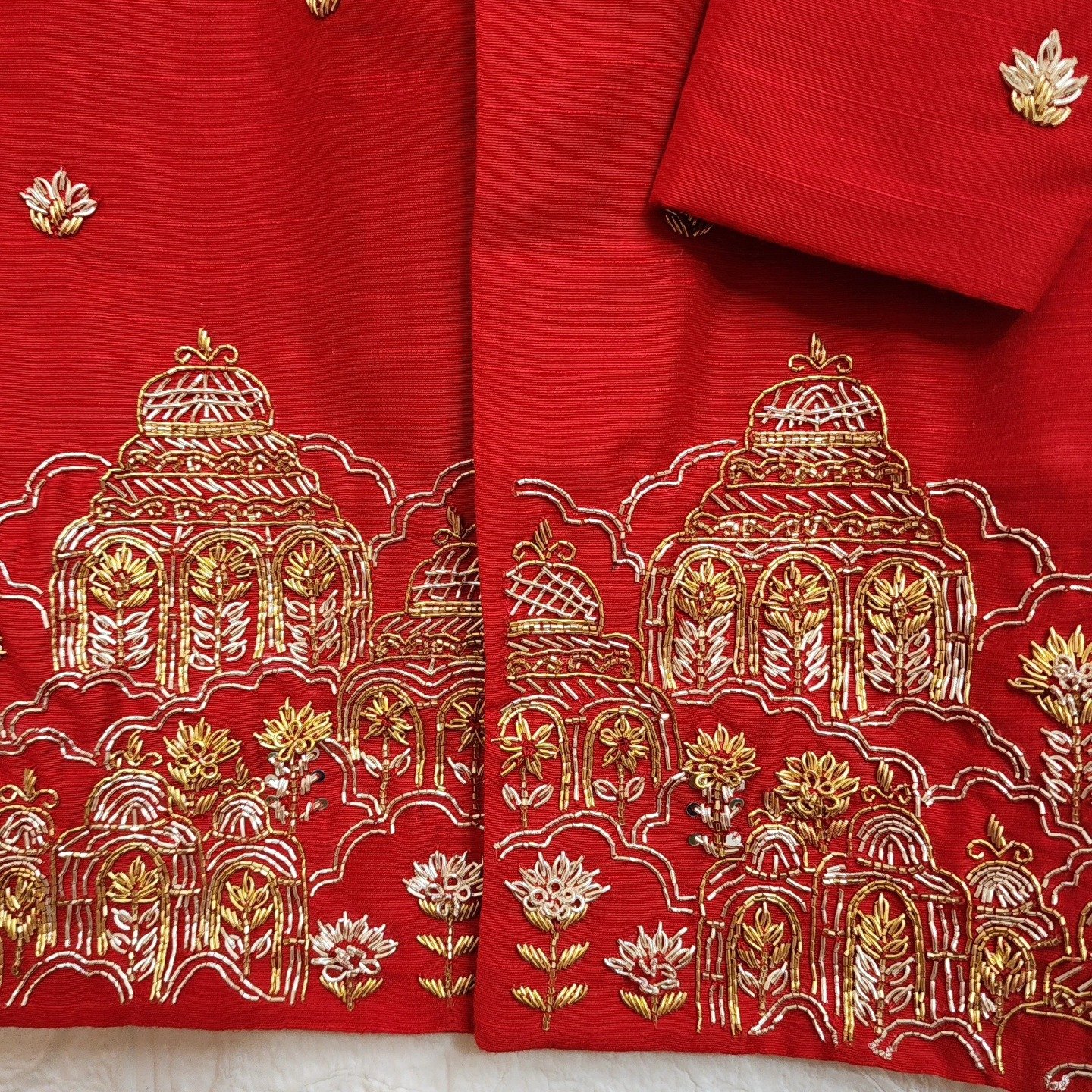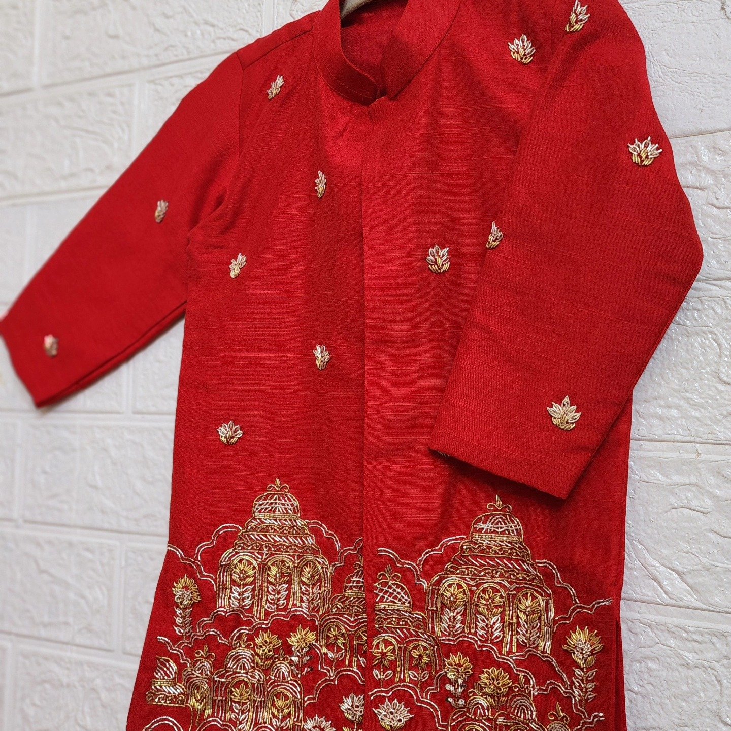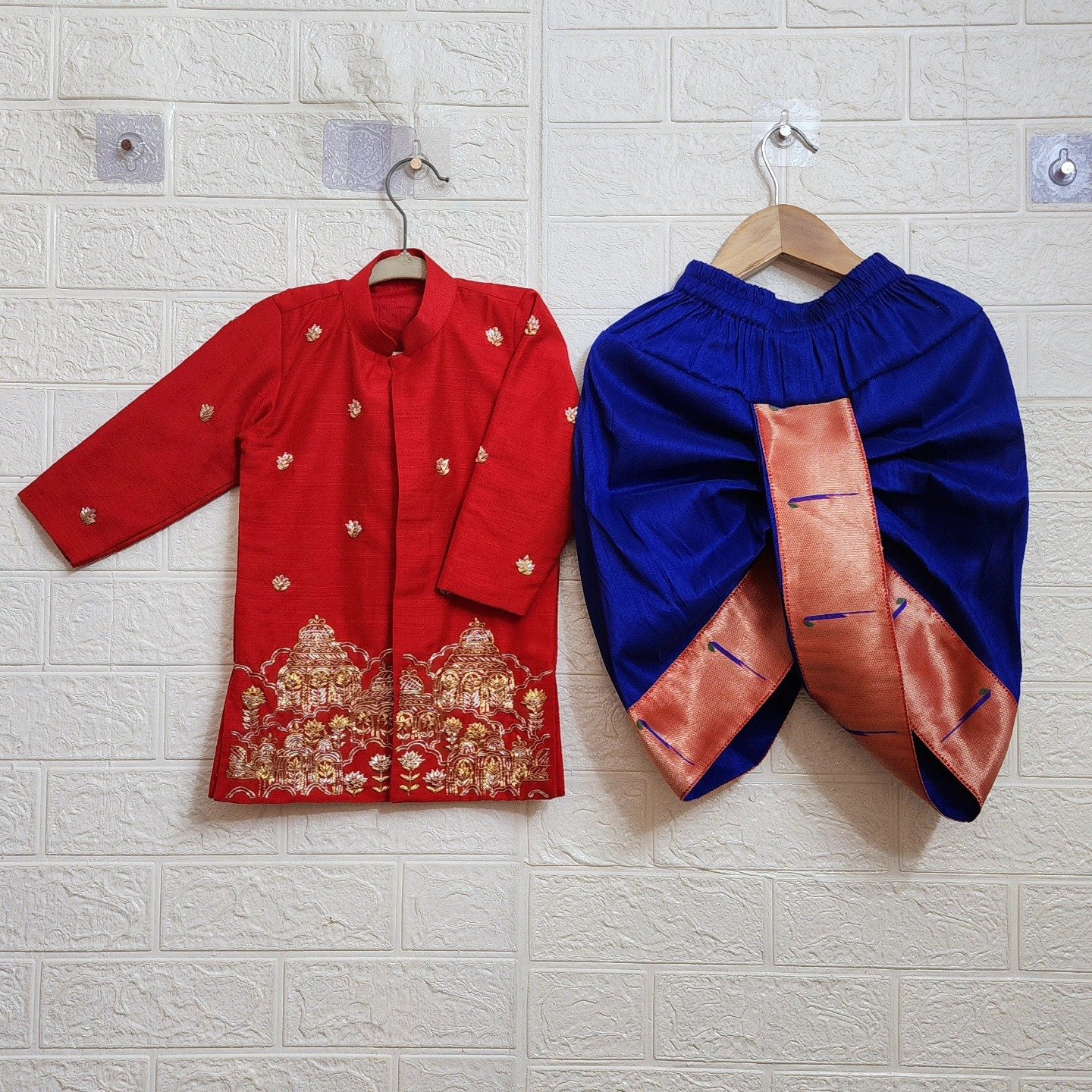 Inspired by timeless temple traditions, this striking red kurta set brings together heritage and elegance in the most charming way. Adorned with subtle temple-themed detailing, the kurta exudes a festive aura, perfectly complemented by a contrasting royal blue dhoti that adds a vibrant twist. Designed for comfort and grace, this ensemble is ideal for poojas, festive celebrations, and cultural occasions—where every step reflects tradition with a stylish flair.