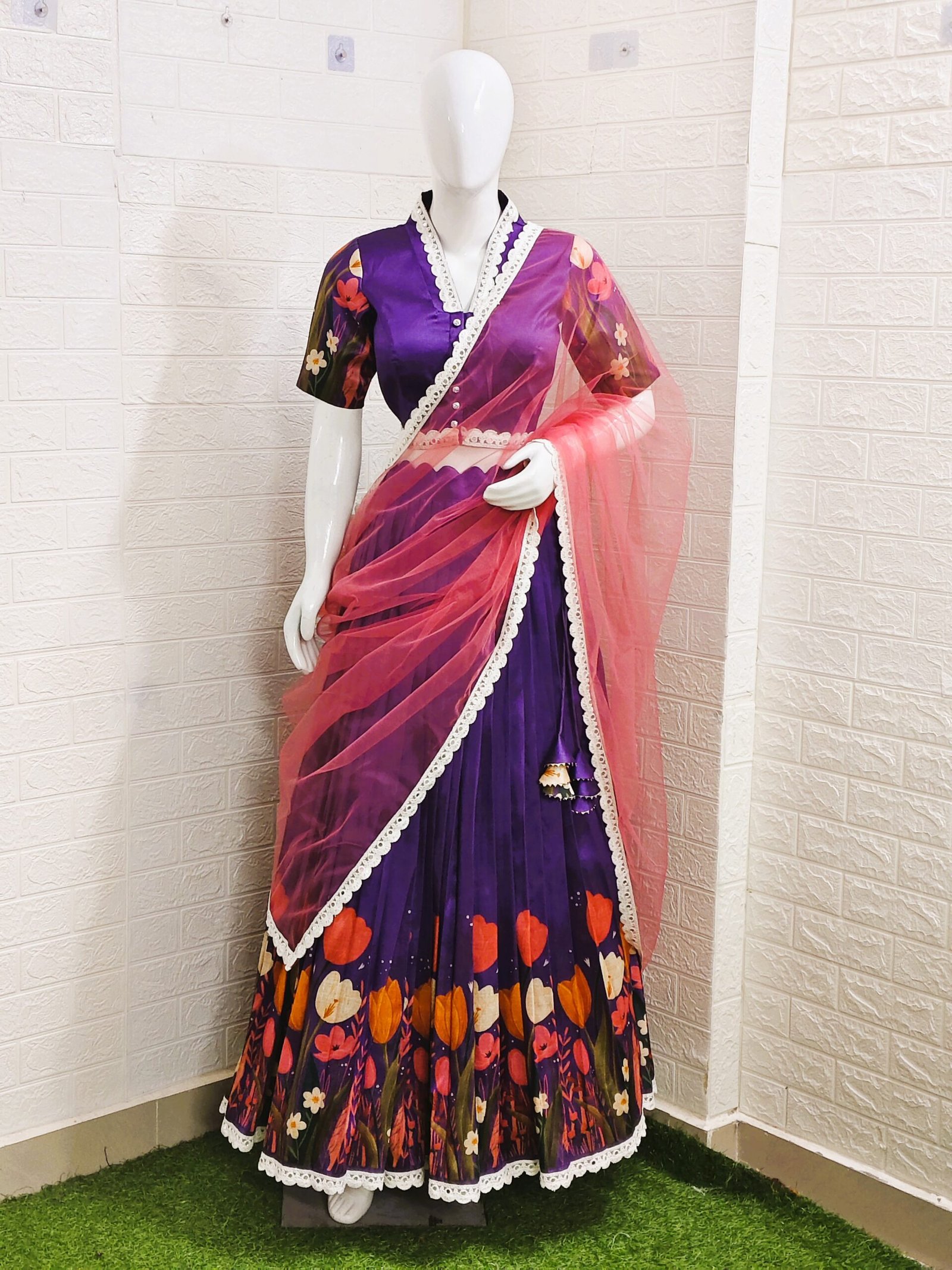 This Tulip Tussar Half Saree features a beautifully crafted designer blouse highlighted with delicate lace accents, creating an elegant yet minimal look that is simple and comfortable to carry.
