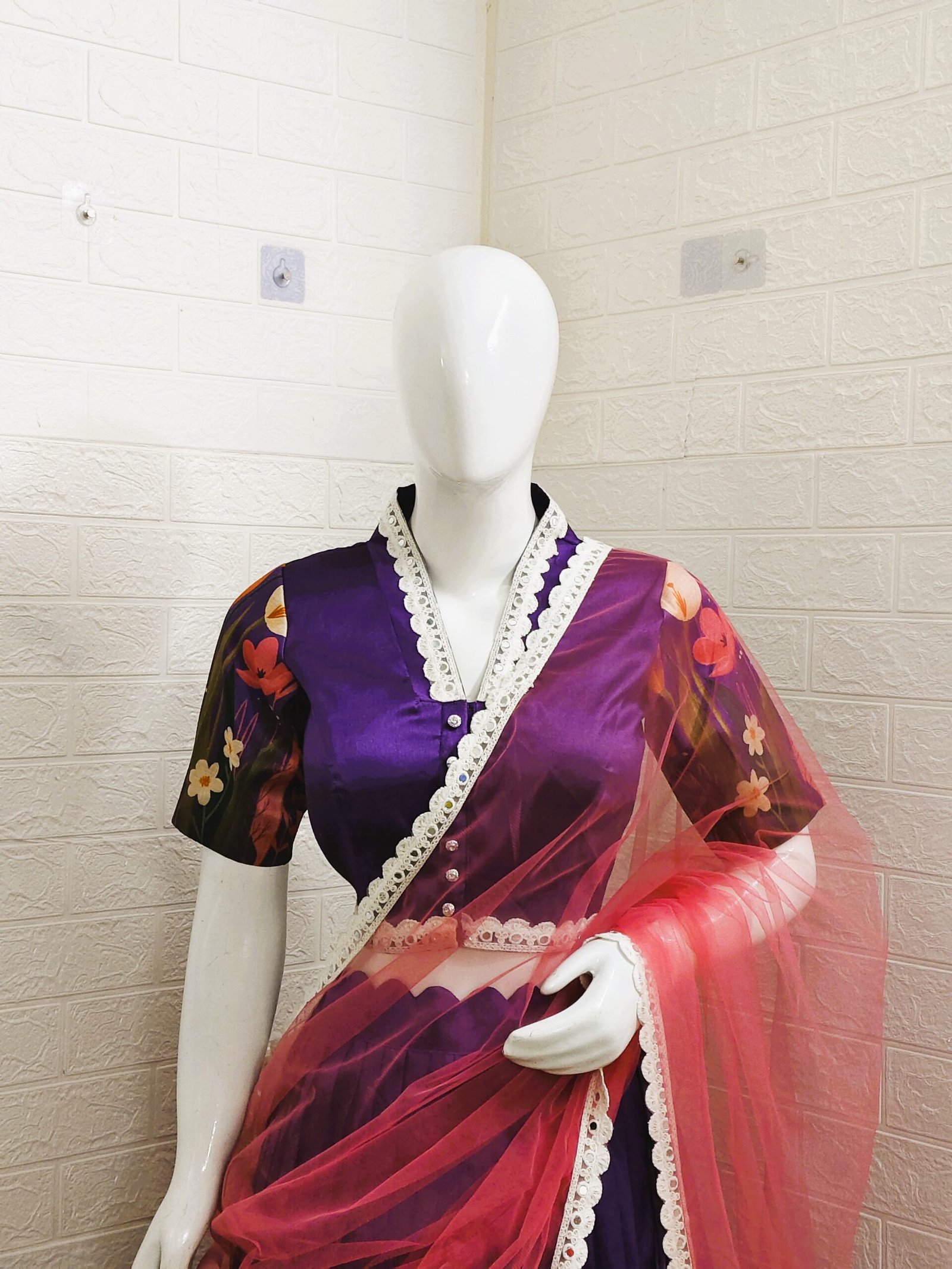 Completing the ensemble, the skirt is enhanced with raw silk scalloped detailing and fine lace work, adding timeless sophistication and graceful movement to the outfit 💫