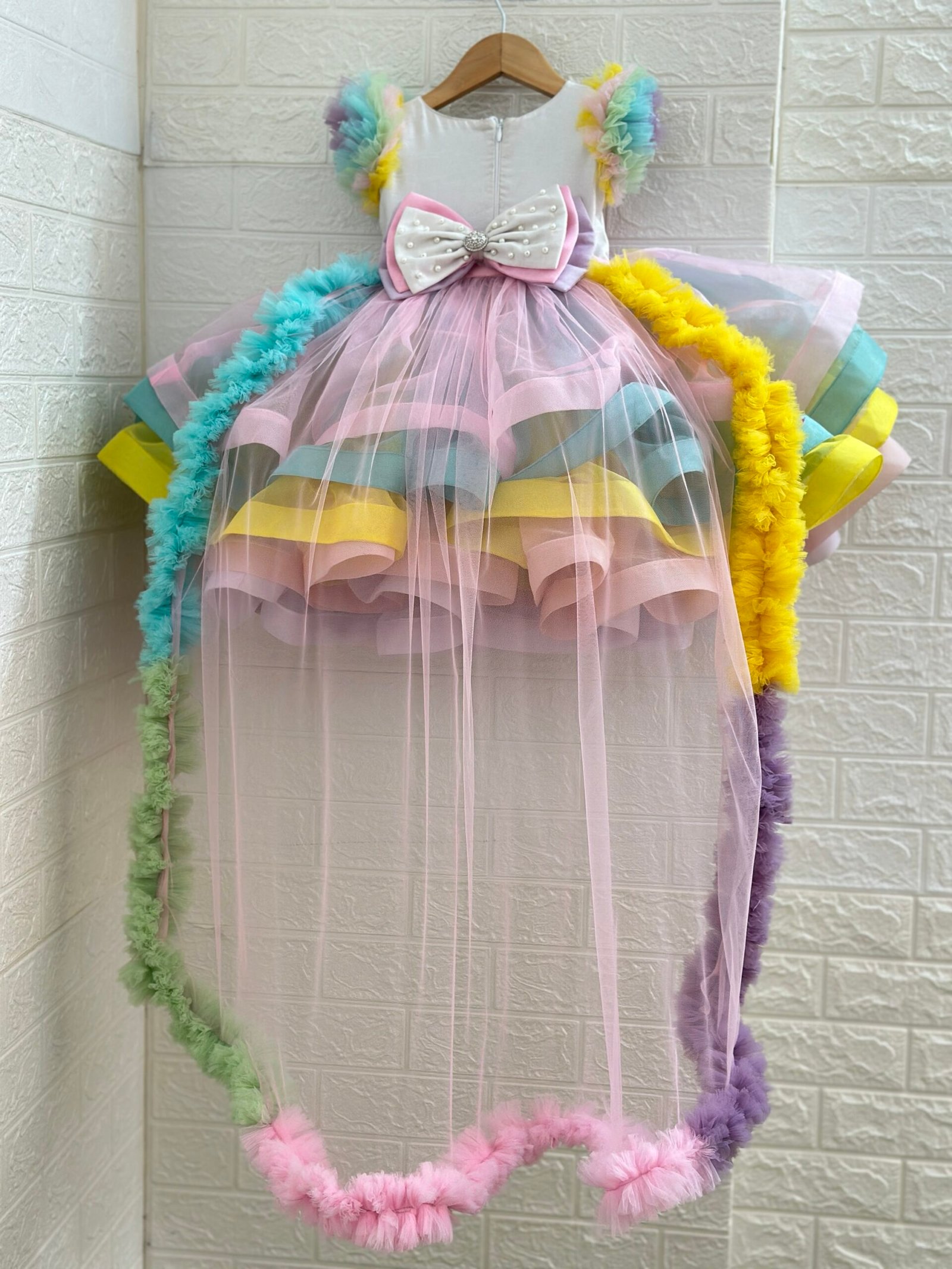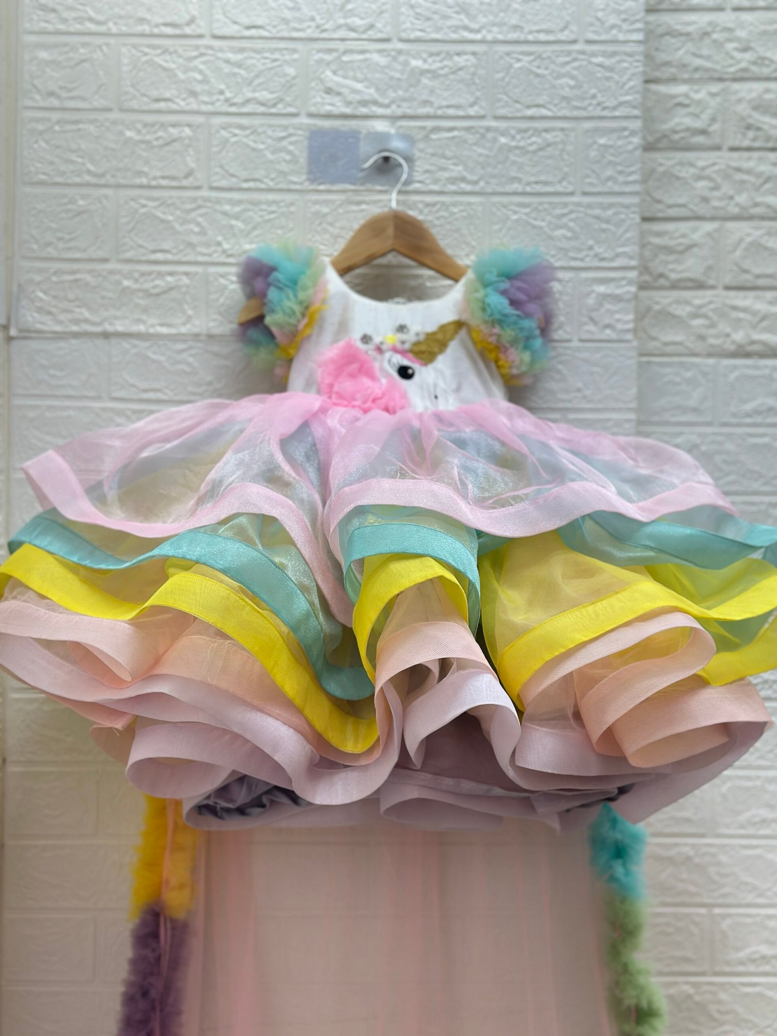 Soft pastel layered skirt crafted with premium Organza fabric, adding volume & a magical unicorn charm.