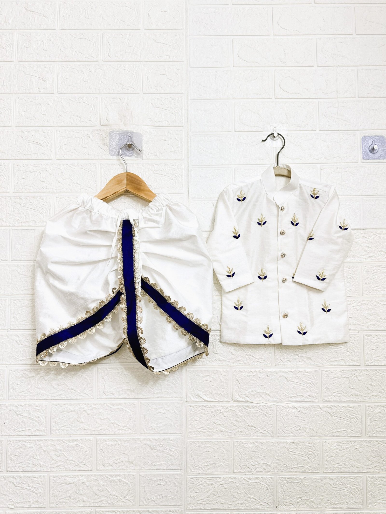 Product Title: Boys’ Festive White Embroidered Kurta with Royal Blue Bordered Dhoti