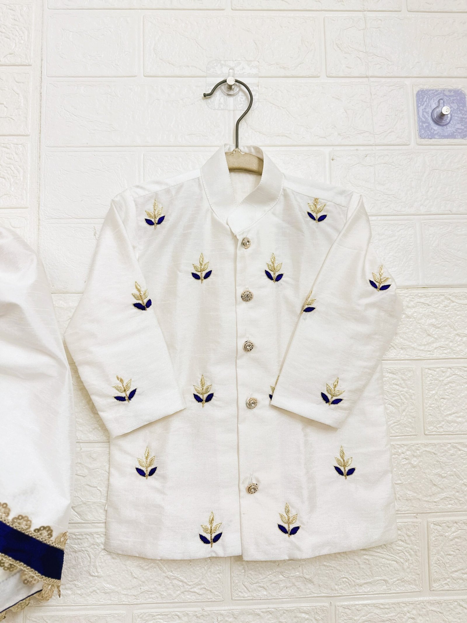 • Short Kurta: A crisp white short-style kurta featuring the signature blue and gold floral embroidery and a Mandarin collar.